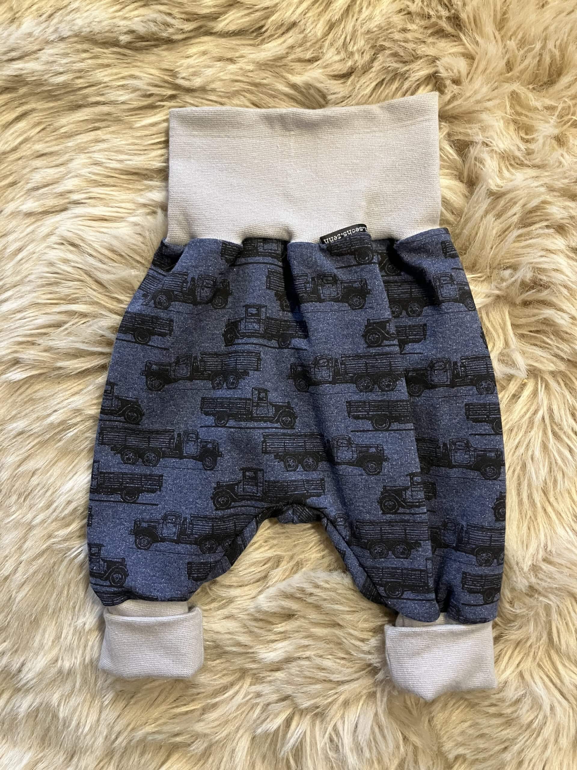 Pumphose "Rennauto" in der Größe 62/68, aus Baumwoll-Sweatstoff (95% Baumwolle, 5% Elasthan), genäht im Burgenland.