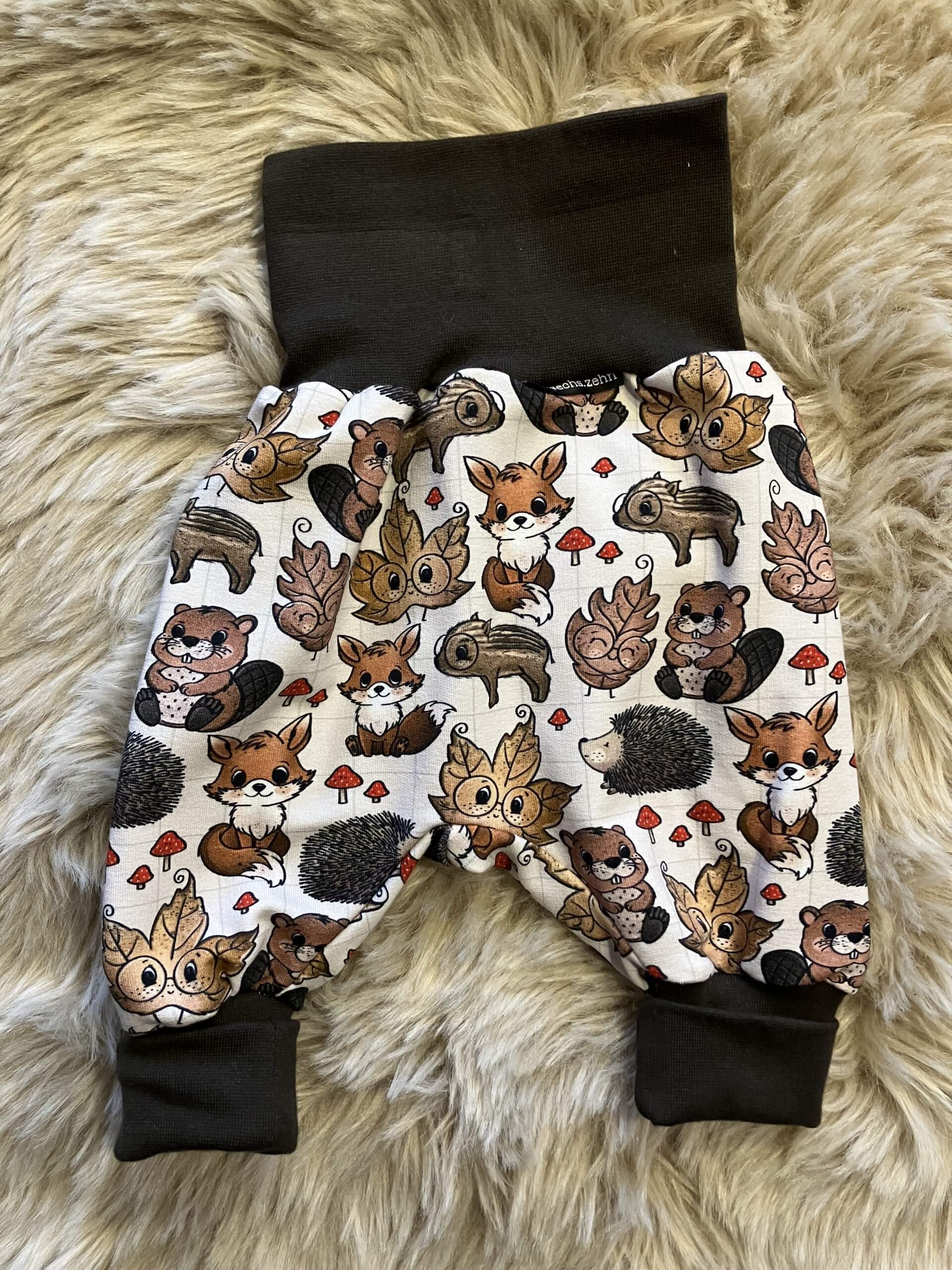 Pumphose "Waldtiere2" in der Größe 62/68, aus Bio-Baumwoll-Sweatstoff (95% Baumwolle, 5% Elasthan), genäht im Burgenland.