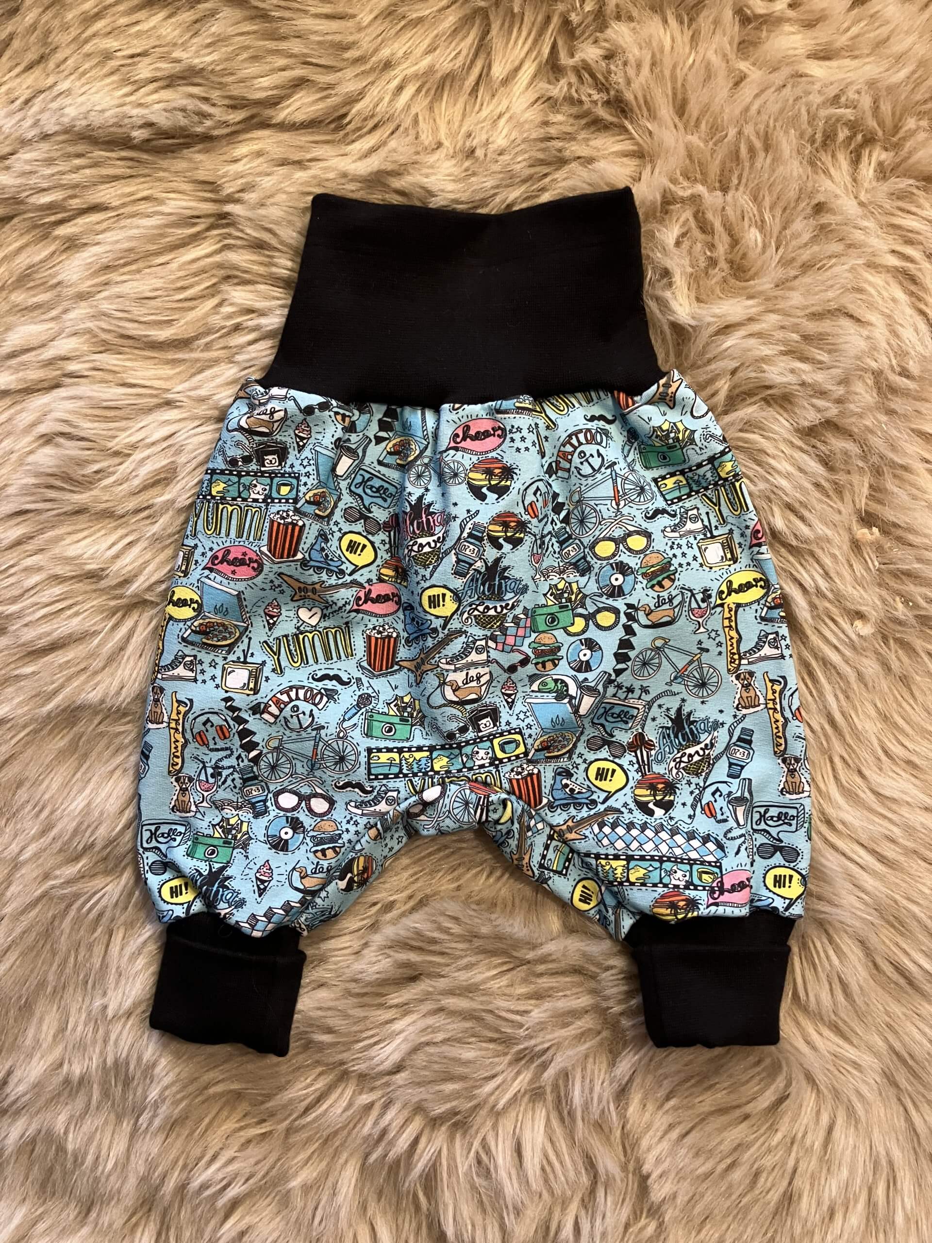 Pumphose "Boys" in der Größe 62/68, aus Baumwoll-Sweatstoff (95% Baumwolle, 5% Elasthan), genäht im Burgenland.
