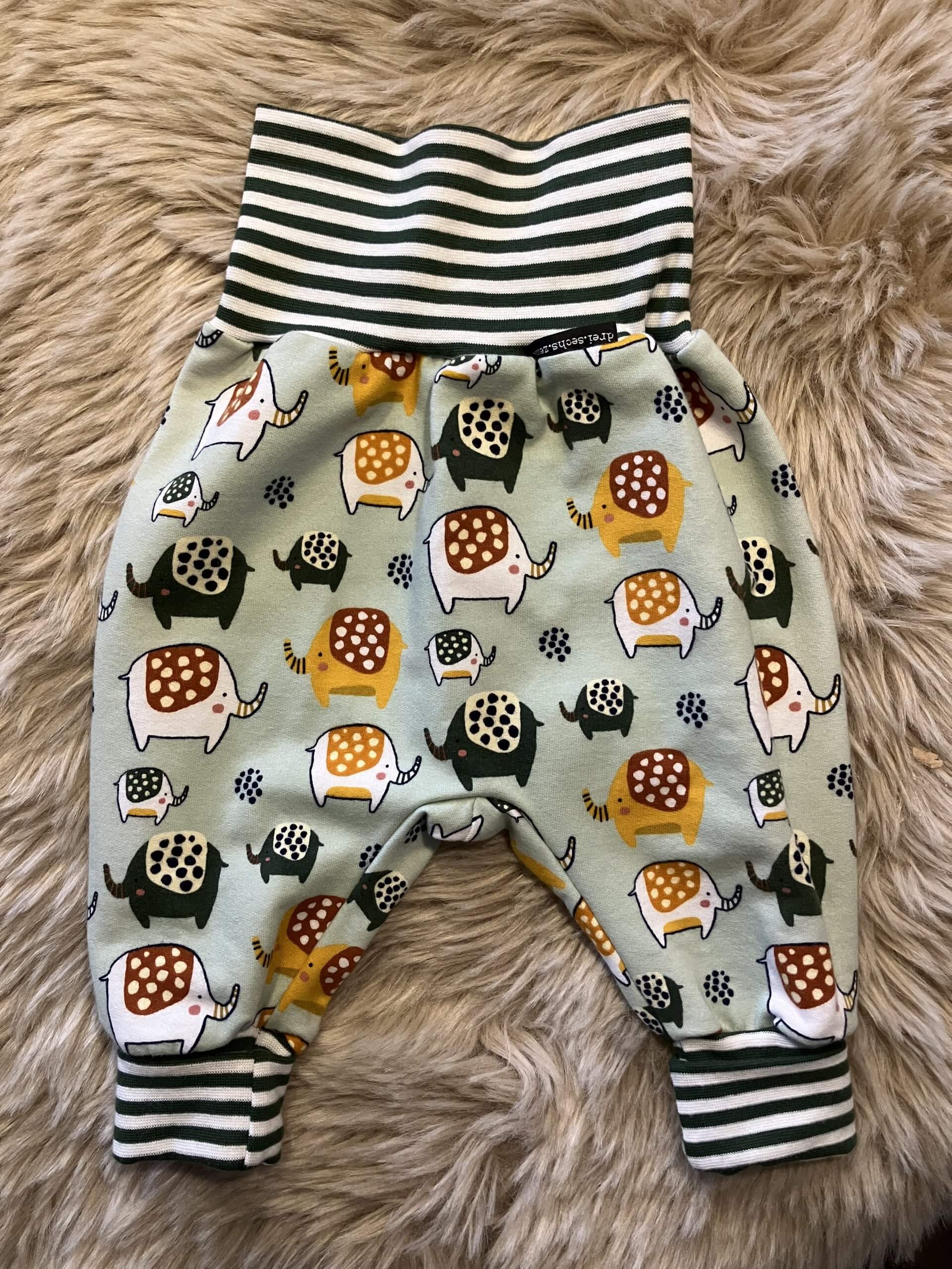 Pumphose "Elefanten" in der Größe 74/80, genäht aus Baumwollsweatstoff (95% Baumwolle, 5 % Elasthan), über zwei Größen mitwachsend, handmade im Burgenland