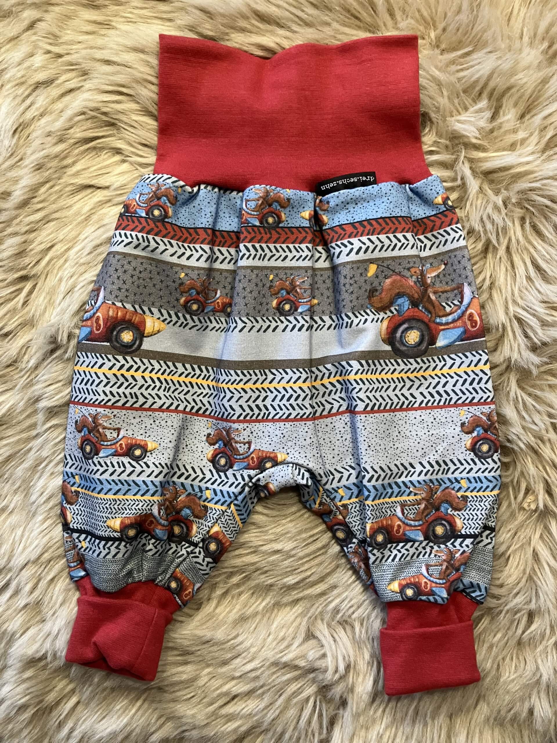 Pumphose "Fuchs im Auto- rot" in der Größe 74/80, genäht aus Baumwollsweatstoff (95% Baumwolle, 5 % Elasthan), über zwei Größen mitwachsend, handmade im Burgenland