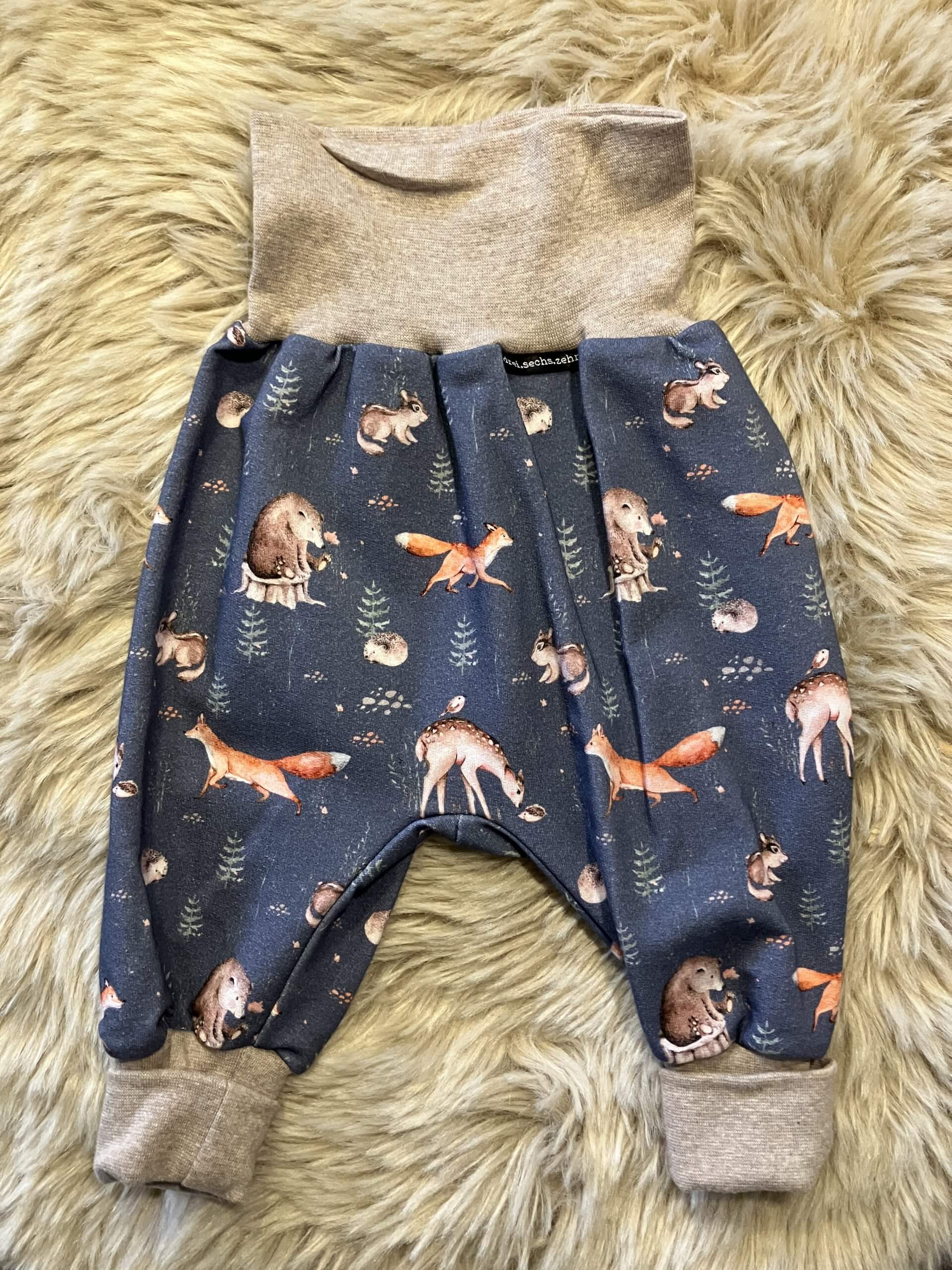 Pumphose "Waldleben blau" in der Größe 74/80, genäht aus Baumwollsweatstoff (95% Baumwolle, 5 % Elasthan), über zwei Größen mitwachsend, handmade im Burgenland