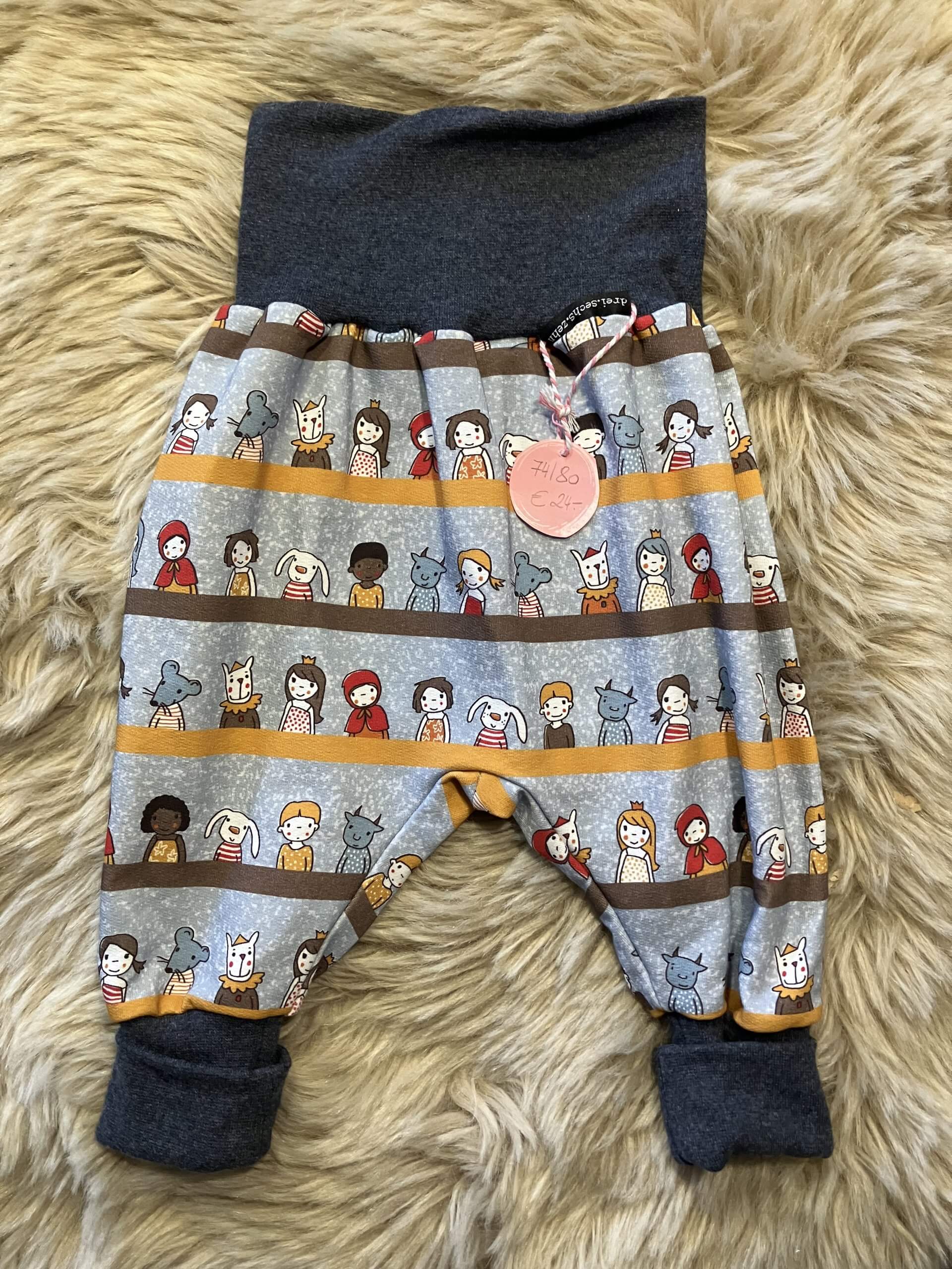 Pumphose "People dunkelgrau" in der Größe 74/80, genäht aus Baumwollsweatstoff (95% Baumwolle, 5 % Elasthan), über zwei Größen mitwachsend, handmade im Burgenland