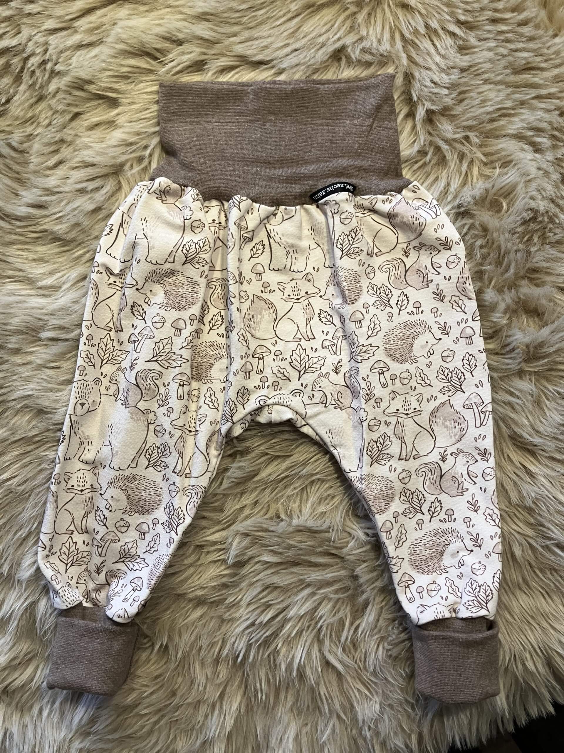 Pumphose "Waldtiere creme" in der Größe 86/92. Aus Bio-Baumwollsweat, über zwei Größen mitwachsend, handmade im Burgenland.