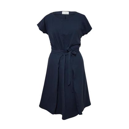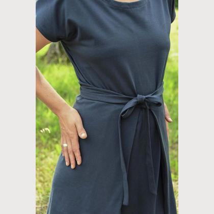 Das Wickelkleid in dunkelblau zaubert immer eine gute Figur. Es wird in der Taille gebunden, ist knielang und hat angeschnittene Ärmel. Hinten lassen die Abnäher den Körper länger und schmaler wirken. Der Bio-Baumwoll-Stoff ist besonders weich, bequem und dabei gerade so dick, dass sich keine Unterwäsche abzeichnet. 95% Bio Baumwolle 5% Elastan Größe M: Länge hinten: ca. 107 cm Brustweite: ca. 97 cm