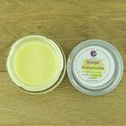 Diese Ringelblumensalbe mit hautpflegender BIO Sheabutter, wertvollem Jojobaöl, Mandelöl und Bienenwachs kann für das Gesicht wie auch für den Körper verwendet werden. Sie ist ein Multitalent in der Anwendung und darf in keinem Haushalt fehlen. Ideal auch als zur Unterstützung des Kälteschutzes für den Winter. Beschreibung: Die guten Eigenschaften der Ringelblume sind seit langer Zeit bekannt. So hat sie ein großes Anwendungsspektrum für den ganzen Körper. Sie ist unschlagbar in ihrer Wirkung. Diese Ringelblumensalbe wurde mit hautpflegender BIO Sheabutter, wertvollem Jojobaöl und Mandelöl angereichert. Bienenwachs verfeinert die schützenden Eigenschaften der Haut. Es wurde auf die Zugabe von Duftstoffen verzichtet. Somit ist die Salbe auch für Kinder und Personen mit empfindlicher Haut geeignet. Ideal als Kälteschutz im Winter! Dieses Produkt ist nahezu wasserfrei. Das heißt, dass hier auf ein Konservierungsmittel ** gänzlich verzichtet wurde. Das Produkt ist gering zu dosieren und kann bei Bedarf mit etwas Wasser emulgiert werden oder auf die feuchte Haut aufgetragen werden. ** Konservierungsmittel sind laut Kosmetikgesetzt erlaubt, hier wird keines eingesetzt, dieser Hinweis dient rein zur Kaufentscheidung. Anwendung: Sparsam in die Haut einmassieren. Sehr ergiebig! Das Produkt ist: handgemacht, sensitiv, Naturkosmetik Gewicht/Größe: 50 ml Verpackung: Glastiegel mit Alu Deckel Wird aufgrund des niedrigen Schmelzpunktes nur bei kühleren Temperaturen versendet! Nachhaltigkeit: Der Glastiegel kann wiederverwendet werden. Beispielsweise für eigene Salben, Marmeladen, Chutneys… Ingredients: Butyrospermum Parkii Butter*, Prunus Amygdalus Dulcis Oil , Simmondsia Chinensis Seed Oil, Cera Alba, Zea Mays Starch, Helianthus Annuus Seed Oil, Tocopherol, Calendula Officinalis Flower*, Daucus Carota Sativa Seed Oil, Beta-Carotene Inhaltsstoffe: SHEABUTTER*, MANDELÖL, JOJOBAÖL, BIENENWACHS, MAISSTÄRKE, SONNENBLUMENÖL, VITAMIN E, RINGELBLUME*, KAROTTENÖL *BIO