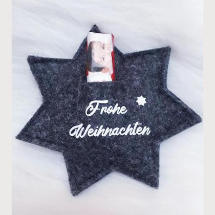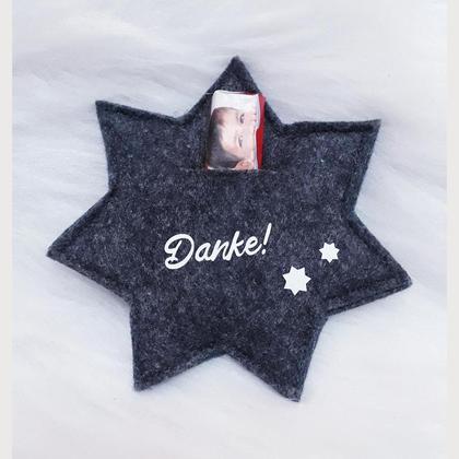 Sterne aus grauem Filz mit einem Schlitz für kleine Geschenke (Geldscheine, Schokoriegel). Höhe: ca. 12cm 3 Motive erhältlich: * Danke! * Wunscherfüller * Frohe Weihnachten