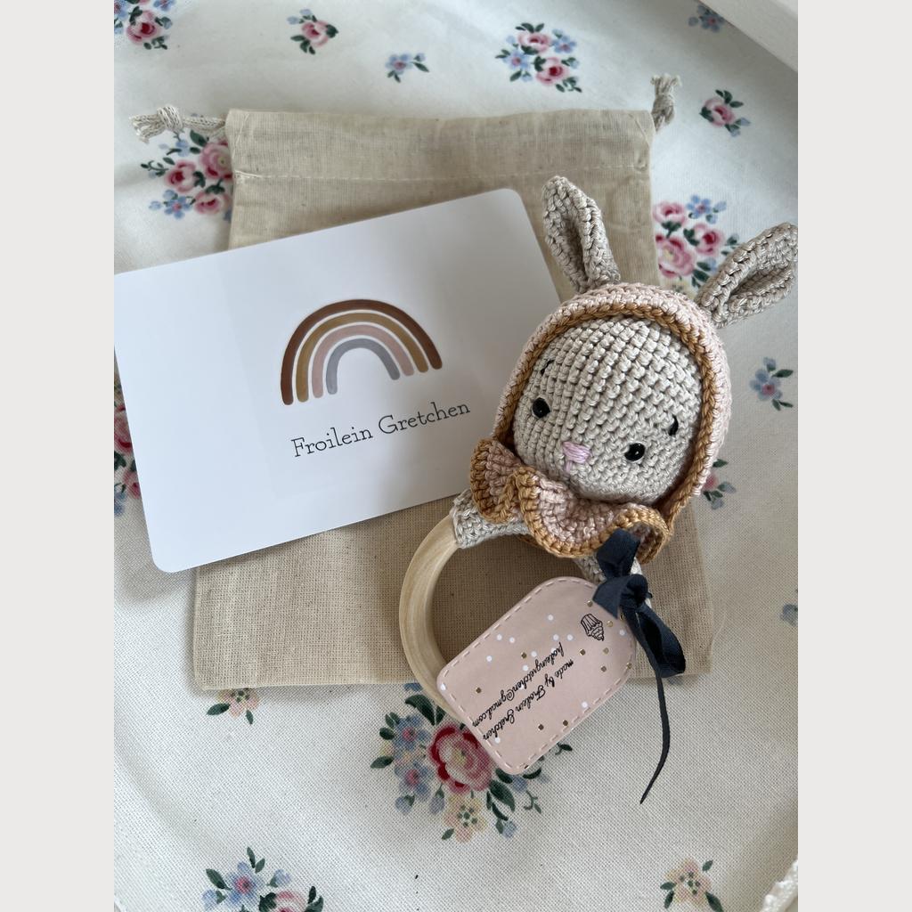 In liebevoller Handarbeit gefertigter Beißring in Form niedlichen Hasen; der Beißring besteht aus 100% unbehandelten Naturholz und Bunny aus 100% Baumwolle. Die Rassel wurde nach dem Design von Lulu loves the moon angefertigt.