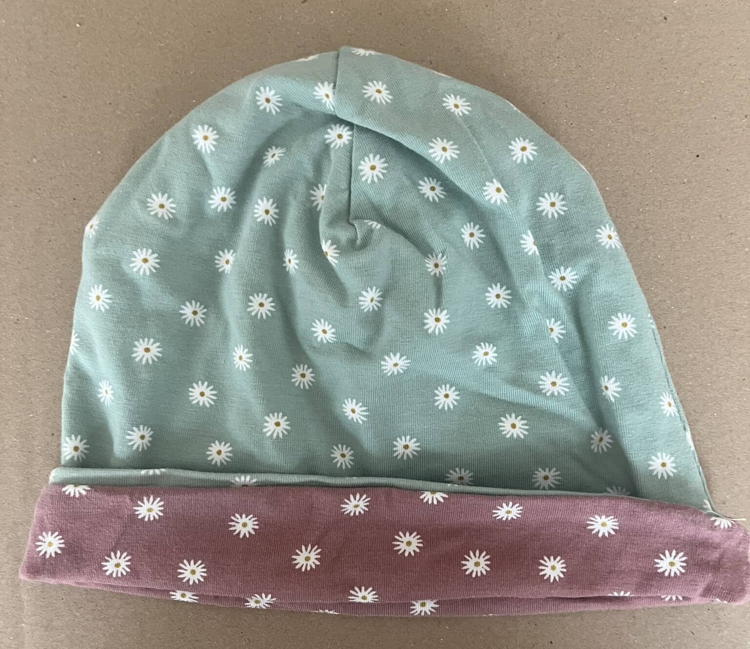 Wendehaube hellgrün / altrosa mit kleinen Blümchen