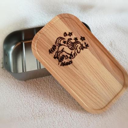 Lunchbox aus Edelstahl - und die Jause ist perfekt verstaut. Diesem Einhorn kann sicher kein Mädchen widerstehen. Die Lunchbox ist aus Edelstahl, silbermatt, mit einem Bambusdeckel, welcher gleichzeitig als Jausenbrett verwendet werden kann. Die Scharniere rechts und links halten den Deckel fest auf der Box und ist ideal für die Schule oder Kindergarten Die Jausenbox ist Geschirrspüler geeignet und rostet nicht. Größe: 18 x 10 x 5 cm Volumen: 700 ml Gerne kann die Lunchdose kostenlos mit einem Namen personalisiert werden.
