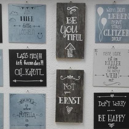 Keramikfliese 20/20cm, mit Aufhängung, für den Innenbereich und geschützten Außenbereich geeignet, frei Hand beschrieben mit Acrylfarbe weiss