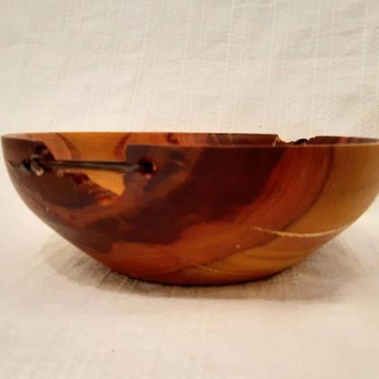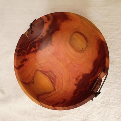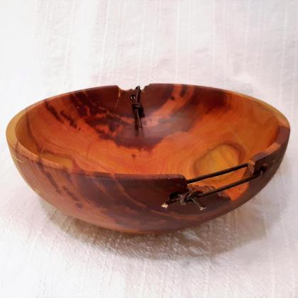 Diese kleine feine Holzschale besticht durch die sehr lebendige und farbintensive Maserung. Die eingeflochtenen Lederbänder kompletieren die ausergewöhnliche Wirkung dieses Werkstücks.