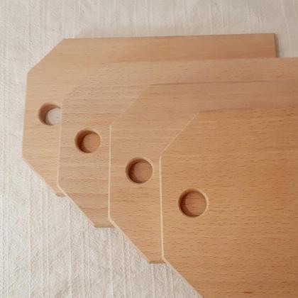 Dieses Bretter-Ensemble besticht durch Form und Funktionalität: Die vier formschönen Jausenbretter aus unbehandeltem Ahornholz finden durch die Lochung bequem PLatz am dazupassenden Ständer. Frisch gereinigte Bretter können so trocknen, ohne das sich das Holz verzieht. Bretter: 230mm x 150mm Ständer: 150mm x 270mm