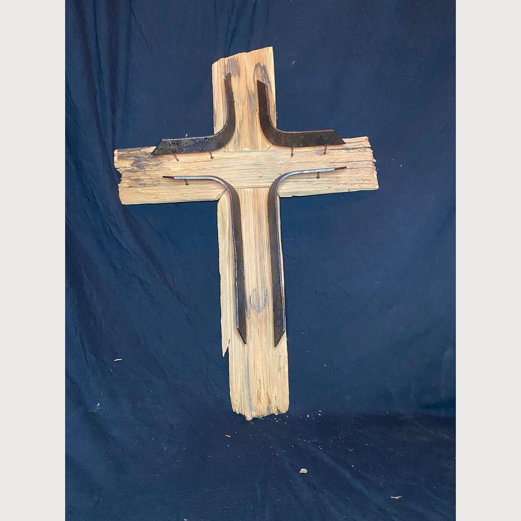 Das Holzkreuz im Hintergrund gibt es ausgeführt in Brettern oder Schindeln. Das draufgesetzte Eisenkreuz wird per Hand gschmiedet.