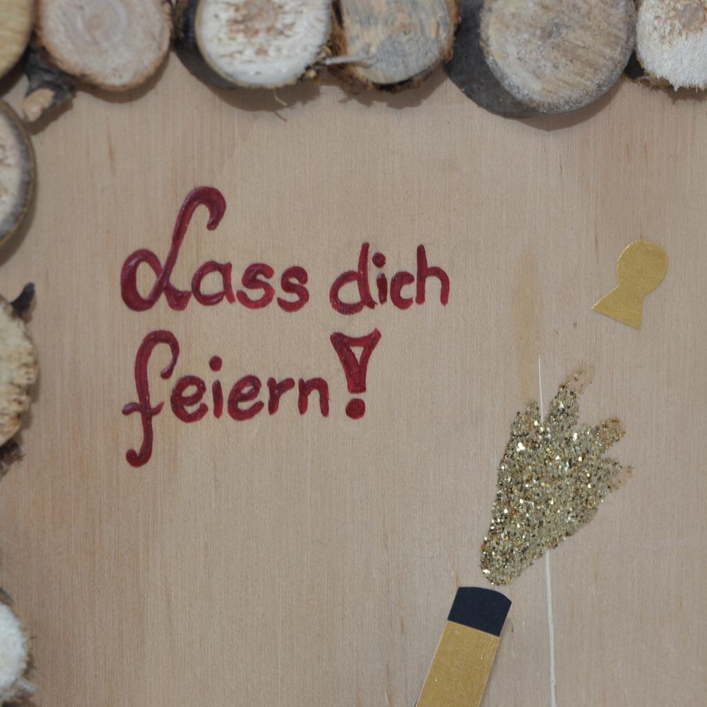 Handgefertigtes Holz Wandbild mit  Motto "Lass dich feiern". Dank Klammer eignet sich dieses Holzbild ideal als Geldgeschenk - Scheine lassen sich problemlos mittels Klammer fixieren. Dieses handgefertigte Unikat ist das perfekte Geburtstagsgeschenk für Geldgeschenke. Die Holzplatte ist mit kleinen Baumscheiben in verschiedenen Größen verziert und der Schriftzug auf das Holz von Hand mittels Acrylfarbe aufgemalt. Maße: ca. 16x13 cm inkl. Wandhaken zur Montage Dieses Unikat ist ideal als Geburtstagsgeschenk, Geldgeschenk, Vatertagsgeschenk, Schulabschlussgeschenk oder viele andere Anlässe.