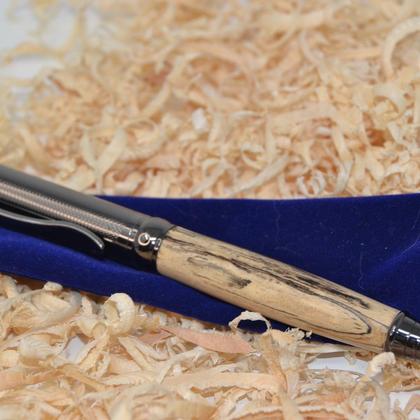 Handgearbeiteter Drehkugelschreiber aus edlem gestockten Hainbuchenholz. Eine tolle Geschenksidee zum Geburtstag, Weihnachten oder anderen Anlass. Eckdaten: Holzart: Hainbuche gestockt Mine: problemlos wechselbar Oberfläche fein geschliffen, lebensmittelecht geölt & versiegelt. Dadurch ist dauerhafter Schutz gewährleistet. Bausatzfarbe: gun metallic Handarbeit Lieferung erfolgt im handgefertigtem Stoff-Täschchen Länge ca. 14 cm Jede Füllfeder ist ein absolutes Unikat und ein ideales Geschenk.