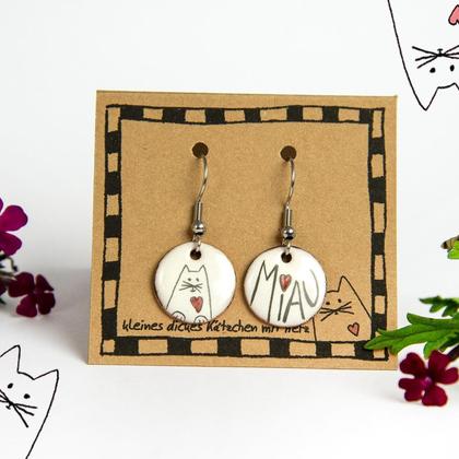Emaille Ohrringe mit Katzen, Katzen Ohrringe, Ohrringe rund MIAU