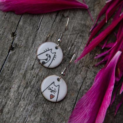Emaille Ohrringe mit Katzen, Katzen Ohrringe, Ohrringe rund