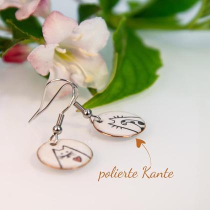 Niedliche kleine Katzen Emaille Ohrringe, kleines dickes Kätzchen mit Die Katzen wurden von Hand gezeichnet und bei ca.850° mehrfach gebrannt. Die Kanten wurden sorgfältig geschliffen und poliert. Jedes Paar Katzen Ohrringe sind ein einzigartiges Unikat und können daher minimal in der Darstellung abweichen. Außergewöhnlicher Ohrschmuck besonders für Katzenliebhaber. Ohrhaken aus Edelstahl Rückseite der Ohrringe, schwarz emailliert Länge der Ohrringe inkl. Haken: 3,4 cm Durchmesser 1,6 cm Jedes paar Emaille Ohrringe wird von mir in mehreren Schritten in meinem kleinen aber feinen Keller Atelier liebevoll handgefertigt. Die Emaille Technik hat eine über 3000 Jahre alte Tradition bei der Glaspulver bei ca.850° auf den Metalluntergrund aufgeschmolzen wird und eine feste Verbindung eingeht. Deine Zufriedenheit liegt mir am Herzen. Solltest Du Fragen haben, so stehe ich Dir gerne zur Seite. Ich bin bemüht den Schmuck in seiner originalen Farbe wieder zu geben, es kann allerdings durch unterschiedliche Bildschirmdarstellungen zu Farbabweichungen