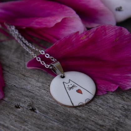 Halskette aus Emaille mit gezeichneter Katze, Katzen Halskette/Katzenanhänger