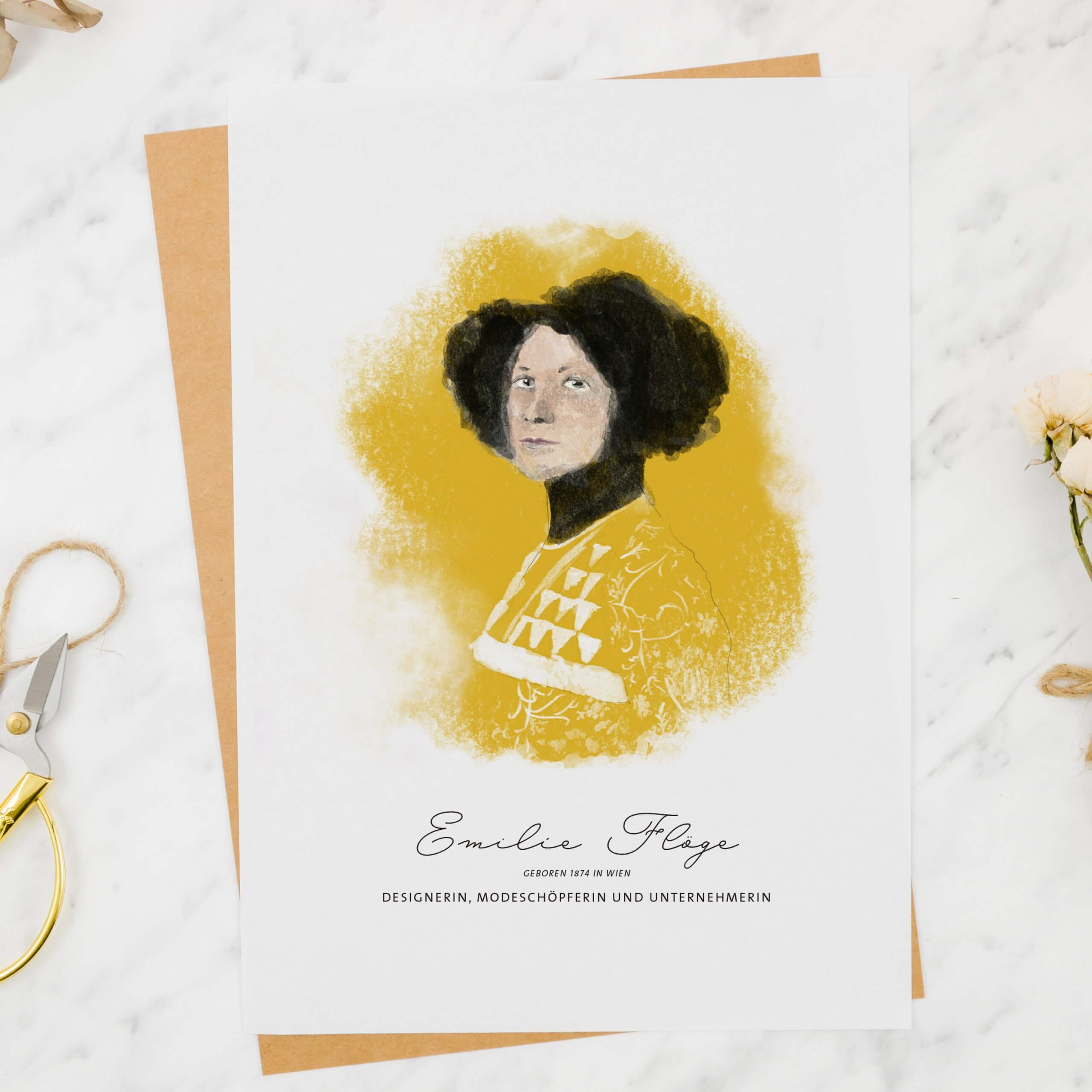 Grußkarte starke Frauen Portrait Emilie Flöge Lass dich von den Geschichten von starken Wiener Frauen inspirieren! Diese Karte zeigt ein Portrait der Modedesignerin Emilie Flöge – ihre bemerkenswerte und inspirierende Lebensgeschichte ist auf der Rückseite abgedruckt. * * * Design: JF Design / Judit Fortelny Papier 220g Premiumkarton Format: A6 Hergestellt in Österreich Karte wird schön verpackt mit passendem Kuvert geliefert