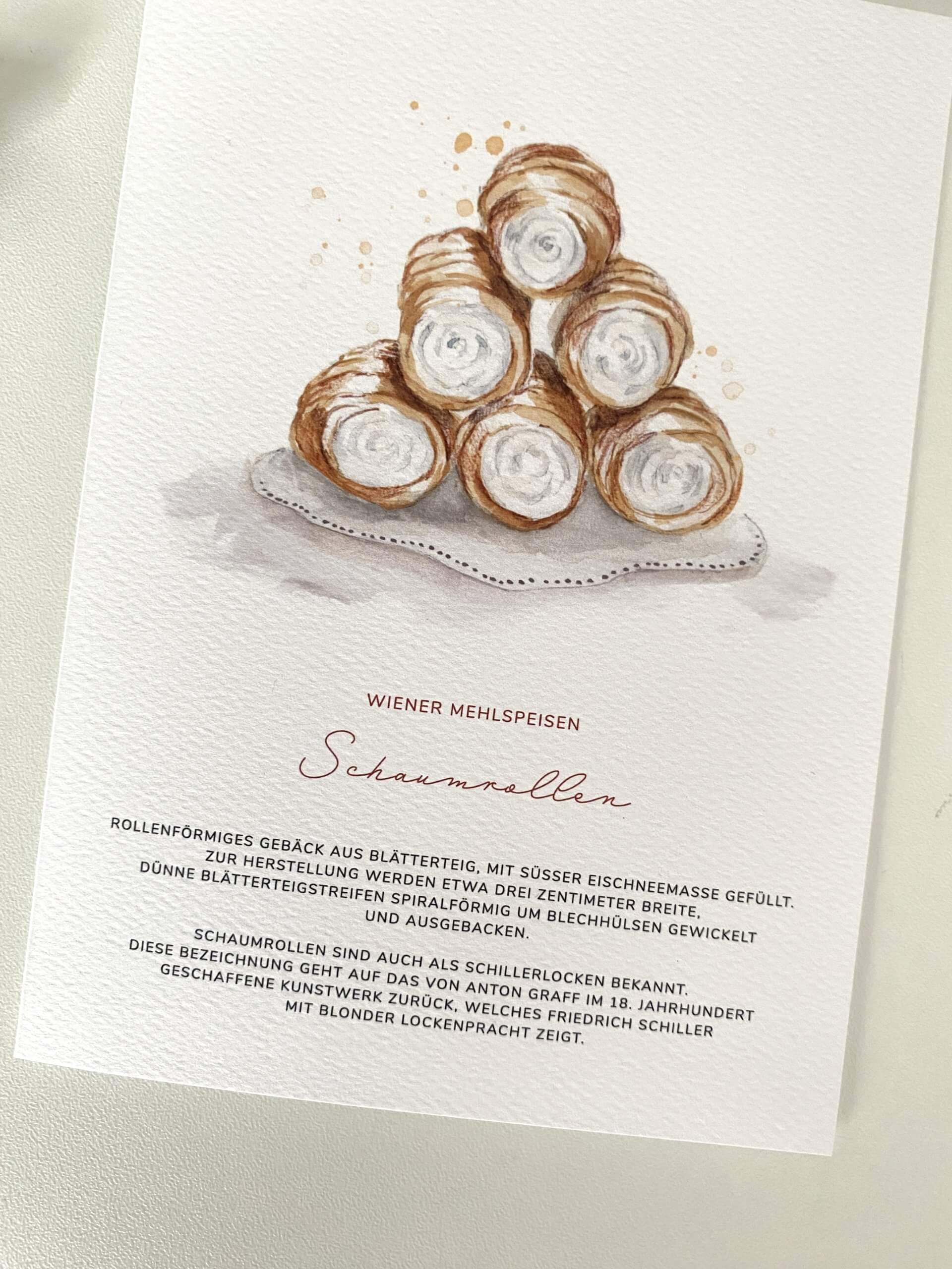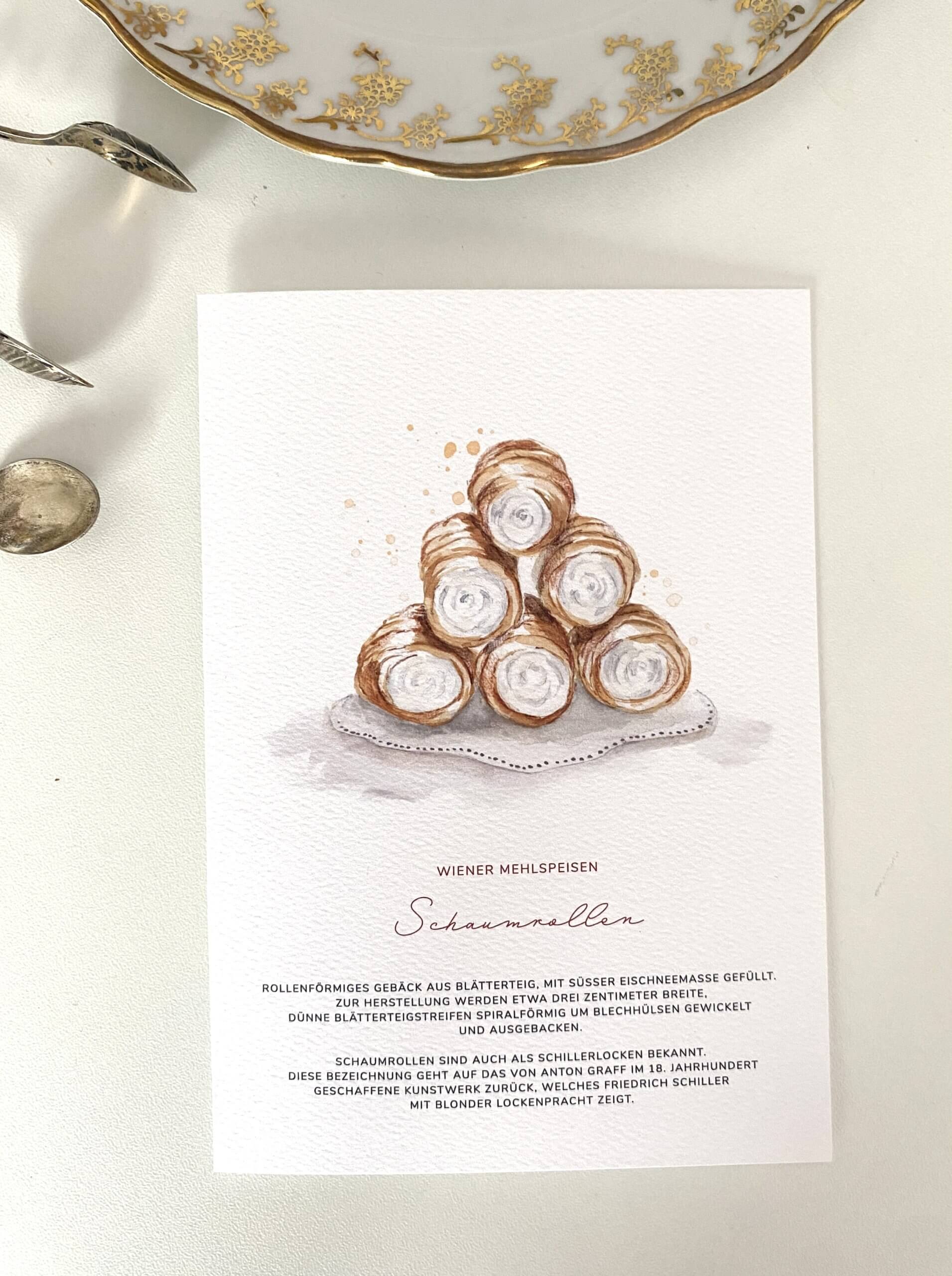 Grußkarte & Kuvert Schaumrollen - Wiener Mehlspeise Köstliche Karte zum verschenken: Die Schaumrollen Diese Karte ist ein Druck von meinem handgezeichneten Aquarell der Schaumrollen, die in keinem Wiener Kaffeehaus fehlen darf. Zusätzlich findet sich auf der Karte Rezeptinfos, Geschichtliches und fun facts. Ein schönes Geschenk für alle LiebhaberInnen der Wiener Küche! Innen sind die Karten weiß, perfekt für eine liebevolle Nachricht. * * * Design: JF Design / Judit Fortelny Papier 220g Premiumkarton Format: A6 Hergestellt in Österreich mit passenden Kraftpapier-Kuvert geliefert * * *