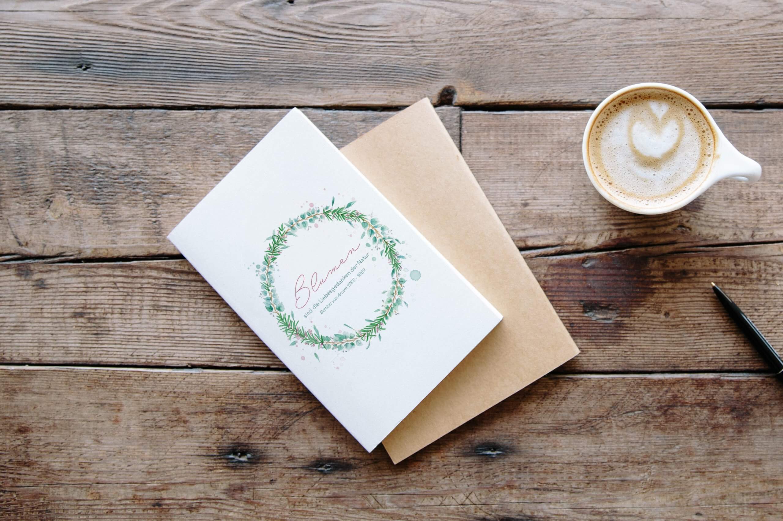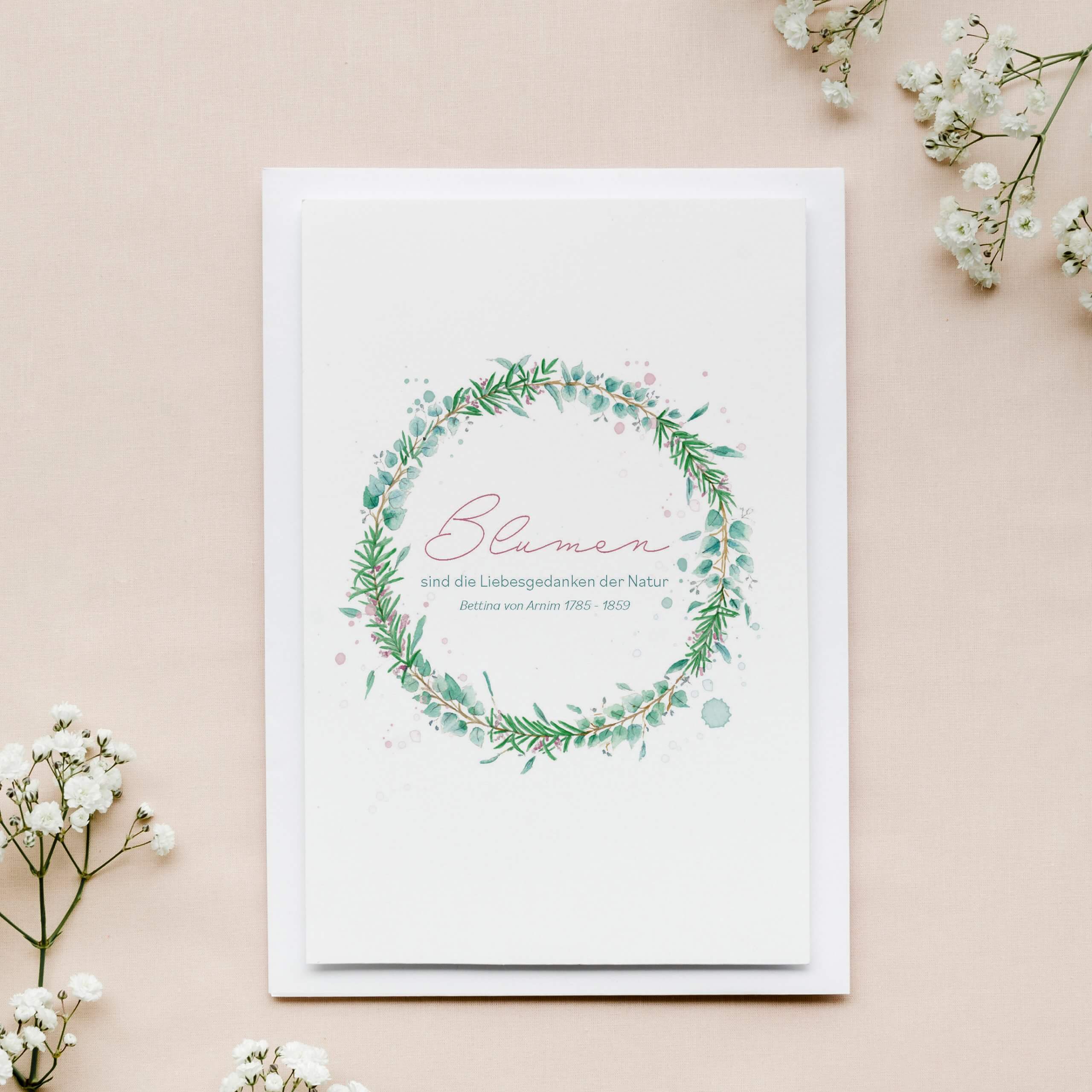 A6 Blumen-Grußkarte inkl. Kuvert Diese zarte Grußkarte ziert ein Kranz aus Rosmarin und Eukalyptuszweigen sowie der inspirierende Spruch von Bettina von Arnim: „Blumen sind die Liebesgedanken der Natur" *** Design: JF Design / Judit Fortelny Papier: Premium Matte Papier Papiergewicht: 300 gsm / 100 lb Format: A6 inkl. Kuvert