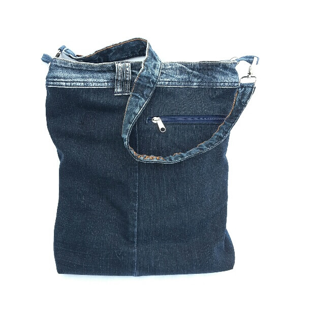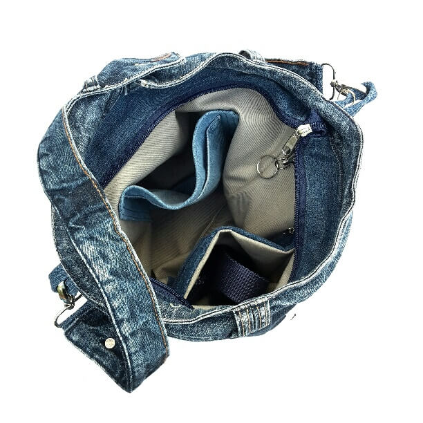 Große Jeanstasche mit Hosenbund-Tragegurt und verstellbarem Gurtbandgurt (nicht auf Abbildung). Besonders raffinierter Hosebundabschlüß oben mit Reißverschluss. 38 cm hoch, 30 - 34 cm breit, Innenfutter beige, 3 Einschubfächer innen, 1 Zippfach innen und außen auf der Rückseite (Ideal für ein Handy), 2 Schlüsselschlaufen mit Mini-Karabiner, 2 abnehmbare Tragegurte, waschbar bei 30°C