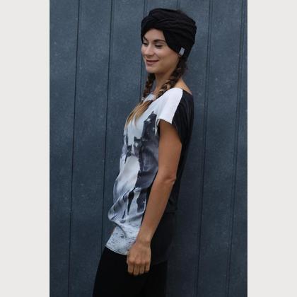 WENDESHIRT "Horse" kann, wie schon der Name sagt, beidseitig betragen werden. Auf einer Seite ist ein Chiffonstoff mit einem schwarz/weißen Pferdemotiv und die andere Seite ist in schwarz gehalten. Je nach Lust und Laune wird das Wendeshirt getragen. Einseitig besticht es durch einen Spitzenträger. MATERIAL: Viskosejersey, Elasthan, PE GRÖßE: M ( das Model trägt Größe S und ist 162 cm groß) FARBE: schwarz, weiß, grau