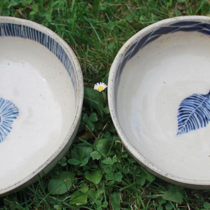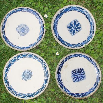 Teller, hoch gebrannt, jedes ein Unikat, Porzellanengobe in Kobalt, geritzt, spülmaschinenfest
