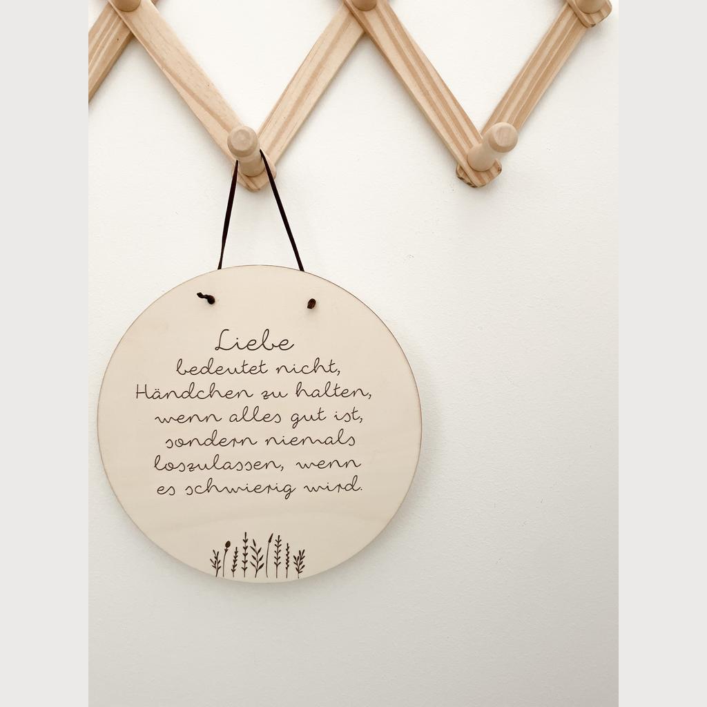 Holzscheibe „Liebe bedeutet nicht, Händchen zu halten, wenn alles gut ist, sondern niemals loszulassen, wenn es schwierig wird.“ Perfekt als Wanddeko. Ein wunderschönes Mitbringsel für Hochzeit, Muttertag, den Lieblingsmenschen, … Durchmesser 20 cm