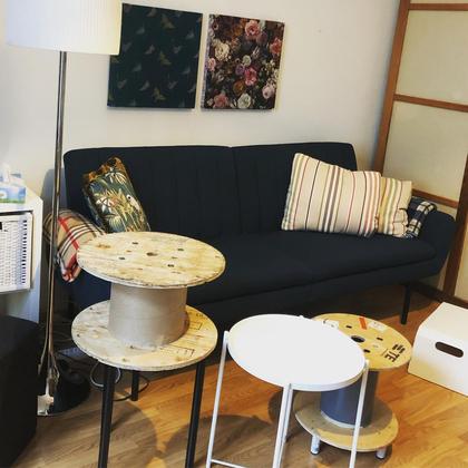 Beistelltisch aus einer Kabeltrommel. Die Höhe ist so, dass sich der Tisch perfekt in der Höhe neben der Couch macht, eben als Beistelltisch