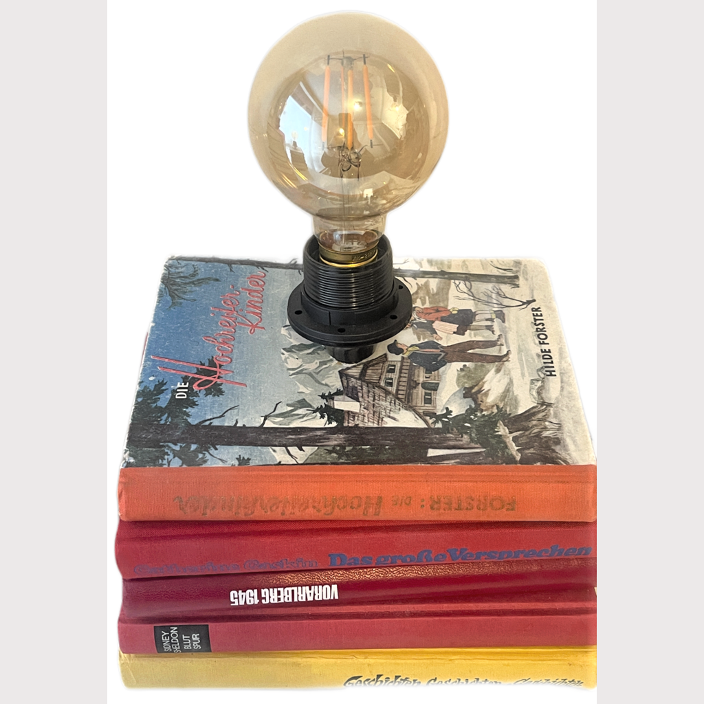 Deckbuch "Hochreiter Kinder" mit 40/50ies Zeichnung Bücher von Schund bis Weltliteratur waren für den Müll vorgesehen. Nun können sie dich erleuchten. E27 Fassung, Kippschalter LED-Leuchtkörper im Lieferumfang enthalten