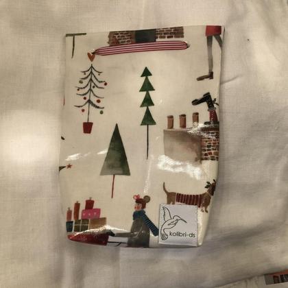 Diese Geschenkverpackung kann „alle Jahre wieder“ verwendet werden. Das Wachstuch ist sehr strapazierfähig und bietet Platz für Bücher, Schmuck, Spielzeug oder was dem Christkind sonst so in die Finger kommt, was nicht zu groß ist. Also Pony geht sich nicht aus. Fesch den Müllberg vermeiden Schleife und Geschenkanhänger im Preis inbegriffen, Farbe/ Muster des Bandes können variieren