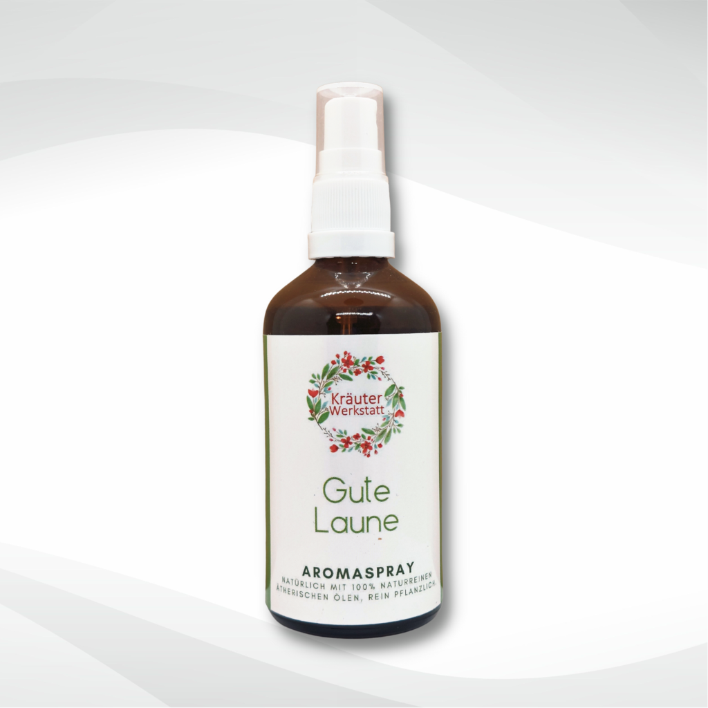 Aromaspray Gute Laune Lachen ist gesund...! Dieser belebende Aromaspray bringt Sonne in dein Zuhause. Der fruchtig-frische Duft sorgt für Unbeschwertheit, Fröhlichkeit, Lebensfreude und gute Stimmung. Sprüh doch die schlechte Laune einfach weg! Was sind Aromasprays...? – Wohlbefinden natürlich fördern. Aromasprays sind die ideale Möglichkeit ein angenehmes Wohlfühlklima zu schaffen und gleichzeitig das Wohlbefinden zu fördern. Diese Aromasprays enthalten 100% naturreine ätherische Öle und sind frei von Konservierungsmitteln und Farbstoffen. Was ist drin...? Rezeptur mit Mandarine, Orange, Grapefruit, .... ANWENDUNG: Vor Gebrauch gut schütteln und 3-4 Sprüher im Raum oder Umgebung verteilen. 100ml Zerstäuber Hinweis: Zur Raumbeduftung. Keine Arznei, kein Biozid und nicht zur Einnahme. Kinder unter 6 Jahren nur unter Aufsicht, nicht in die Augen sprühen. Keinesfalls fordere ich dazu auf, eine ärztliche Behandlung oder Medikation abzubrechen oder sogar zu ersetzen. Heilversprechen gebe ich in keinster Weise ab und ich verspreche auch nichts Derartiges. Hinweise zu Wirkung und Anwendung lt. Literatur.