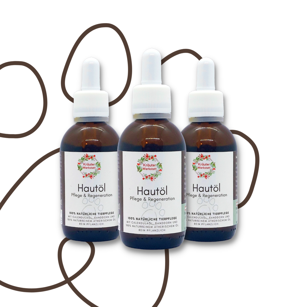 Natürliches HAUTÖL für Hunde zur Hautpflege und bei Irritationen Hergestellt in Österreich aus rein pflanzlichen, hochwertigen und natürlichen Rohstoffen. Mit Ringelblumen- und Sanddornfruchtfleischöl und 100% naturreinem ätherischem Öl. Zur Pflege irritierter Haut sowie zur Nachpflege von bereits verschlossenen kleinen Wunden. Dieses Hautöl macht die Haut weich und geschmeidig, unterstützt die Wundheilung und hat einen positiven Effekt auf die Narbenbildung. FÜR WELCHE HUNDERASSE Für alle Hunderassen bestens geeignet - auch für empfindliche Haut. ANWENDUNG Bei Bedarf mehrmals täglich auf die betroffene Hautstelle oder die bereits verschlossene Wunde auftragen, um die Regeneration zu unterstützen und die Haut zu pflegen. DAS BESONDERE 100% natürlich aus besten Rohstoffen rein pflanzlich mit naturreinen äther. Ölen ohne Konservierungsstoffe hergestellt in Österreich 50ml Braunglas/Pipette Inhaltsstoffe in Deutsch: Ringelblumenöl, Sanddornfruchtfleischöl, ätherische Öle Lavendel, Vitamin E. Ingredients: GLYCINE SOJA OIL, HIPPOPHAE RHAMNOIDES FRUIT OIL, LAVANDULA ANGUSTIFOLIA OIL, CALENDULA OFFICINALIS FLOWER EXTRACT, TOCOPHEROL, LIMONENE*, LINALOOL*. *natürlicher Bestandteilätherischer Öle. Hinweis: Bestimmt für die Tierpflege, keine Arznei und kein Biozid.