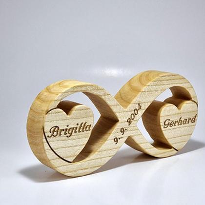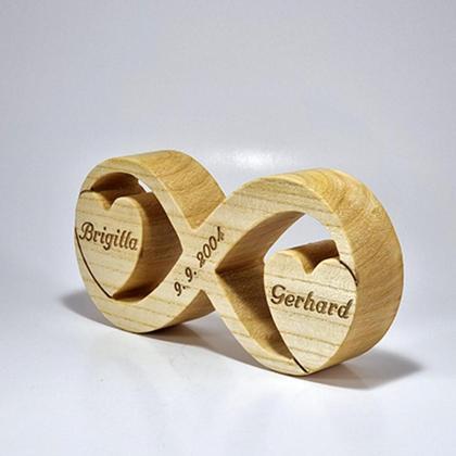 2 Herzen in Unendlichzeichen eingefügt Material: Esche, aus einem Stück gefräst und graviert Größe: 23x11x4 cm (BxHxD)