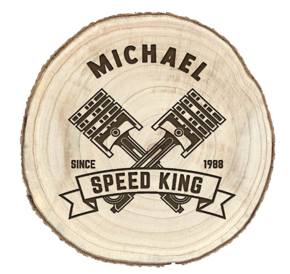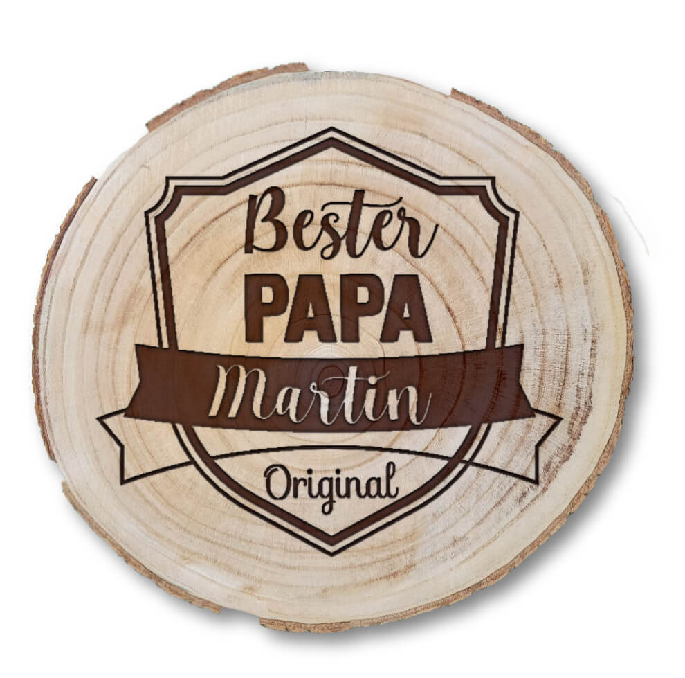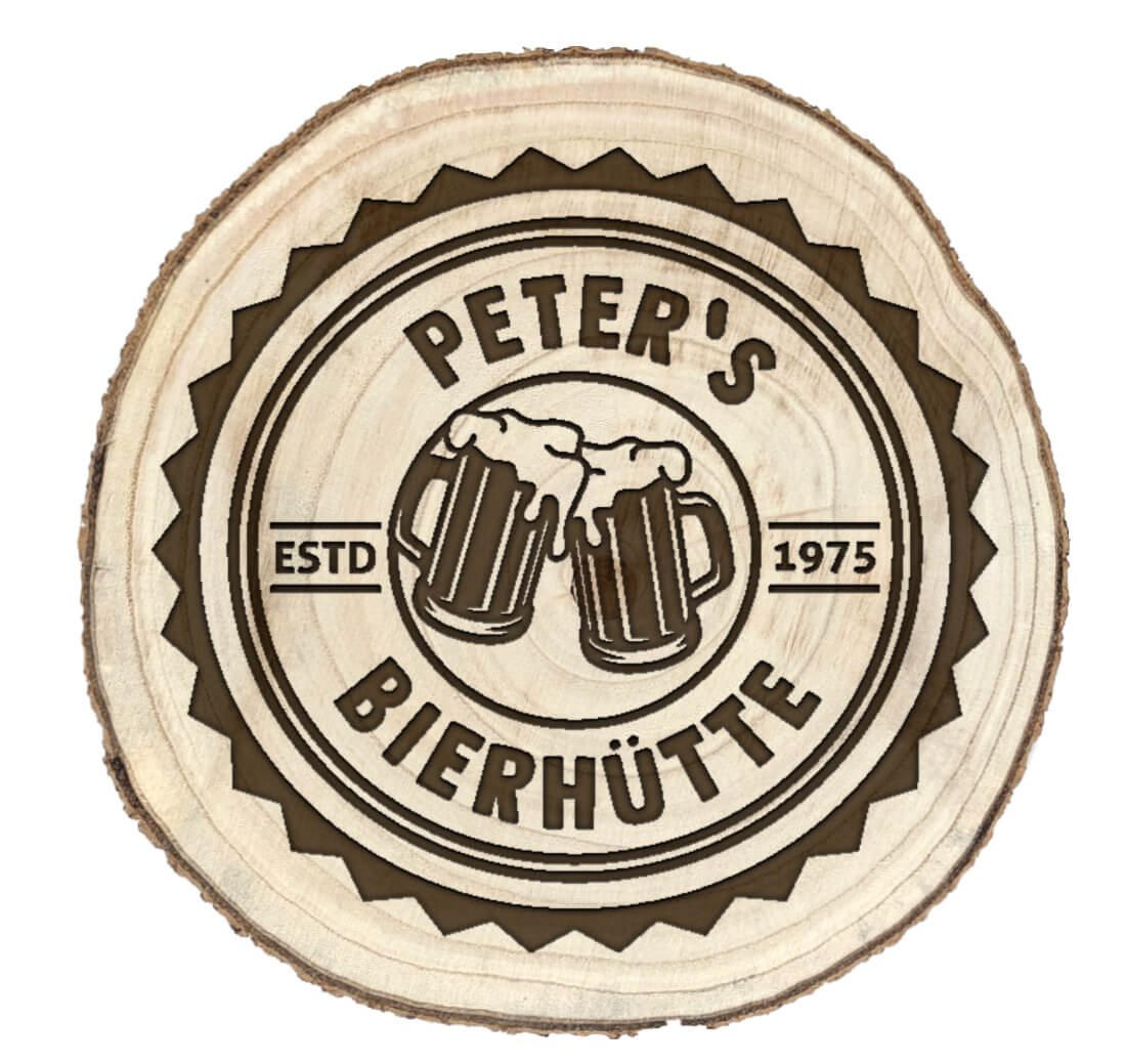 Ob Logo, Wappen, persönliche Widmung oder ein besonderes Symbol – wir gravieren dein Motiv präzise und langlebig in hochwertiges Naturholz. Jede Baumscheibe ist ein Unikat mit eigener Maserung und verleiht deiner Gravur einen natürlichen Charakter.
