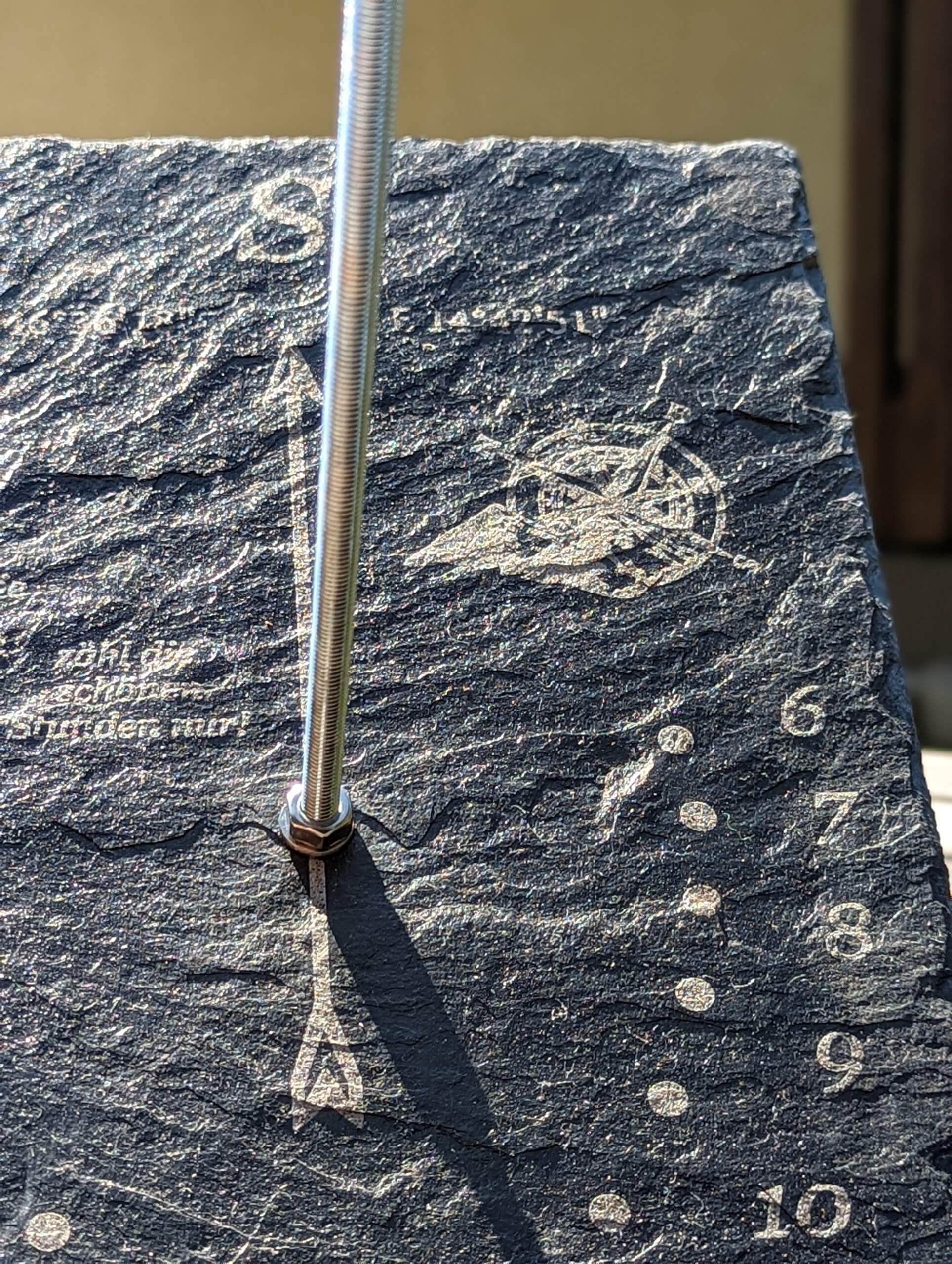 Schiefer-Sonnenuhr mit gelasertem Namen / Logo / Positionsdaten. Die Gewindestange dient als Sonnenzeiger. Auf der Rückseite der Stange wird die "Schraube" vormontiert, um den genauen "Grad" der GPS-Koordinaten zu haben. ZUM BEISPIEL: GPS Koordinaten von Wien: 48° 12' 29.88 N 16° 22' 23.16 E. / Grad wäre: 48° / In diesem Winkel muss die Sonnenuhr aufgestellt werden um die Zeit genau anzuzeigen. Die Schraube an der Rückseite wird von uns schon voreingestellt, damit der Winkel stimmt. Aufstellung: Uhr solange drehen bis diese mit Ihrer "Uhrzeit" übereinstimmt.