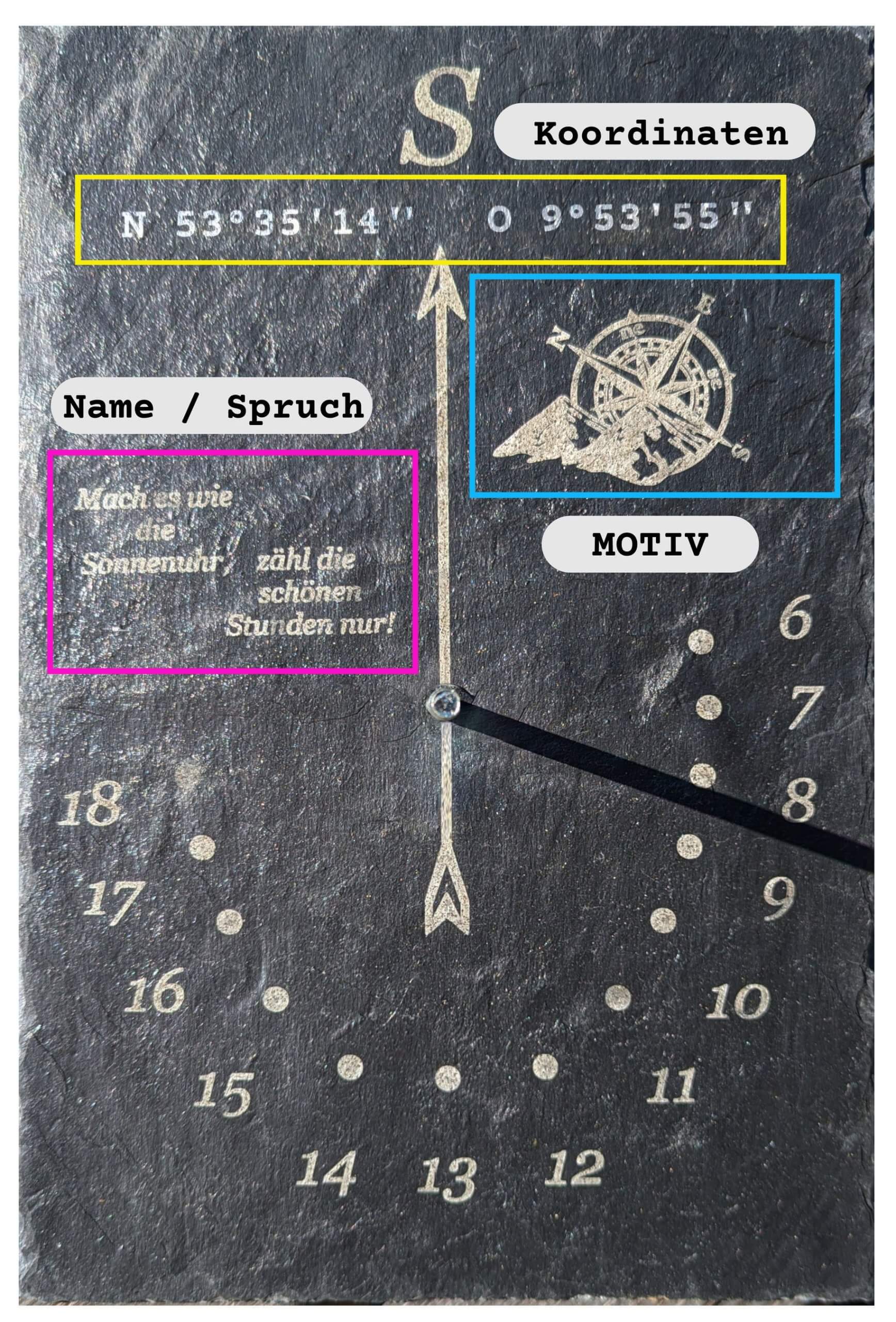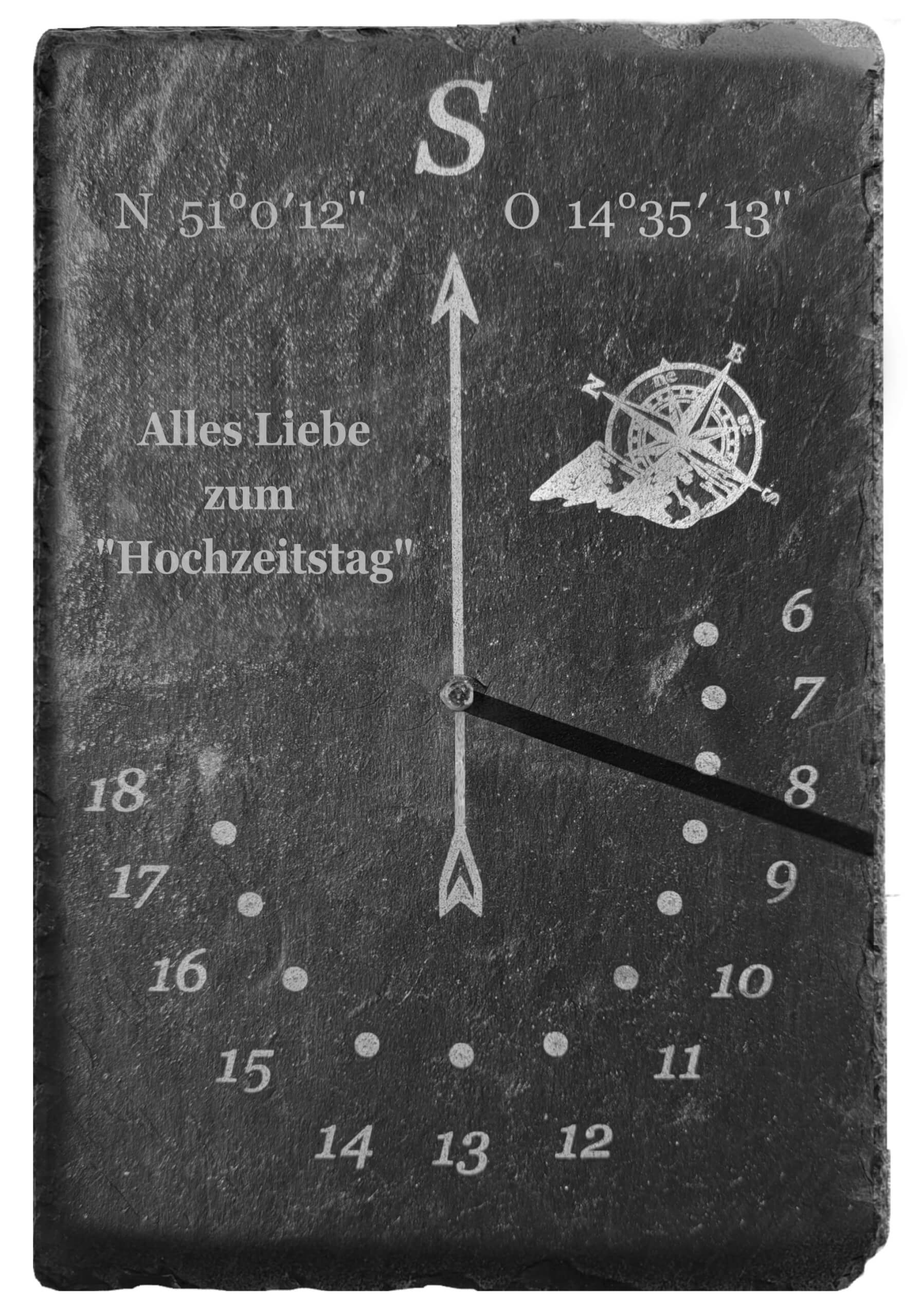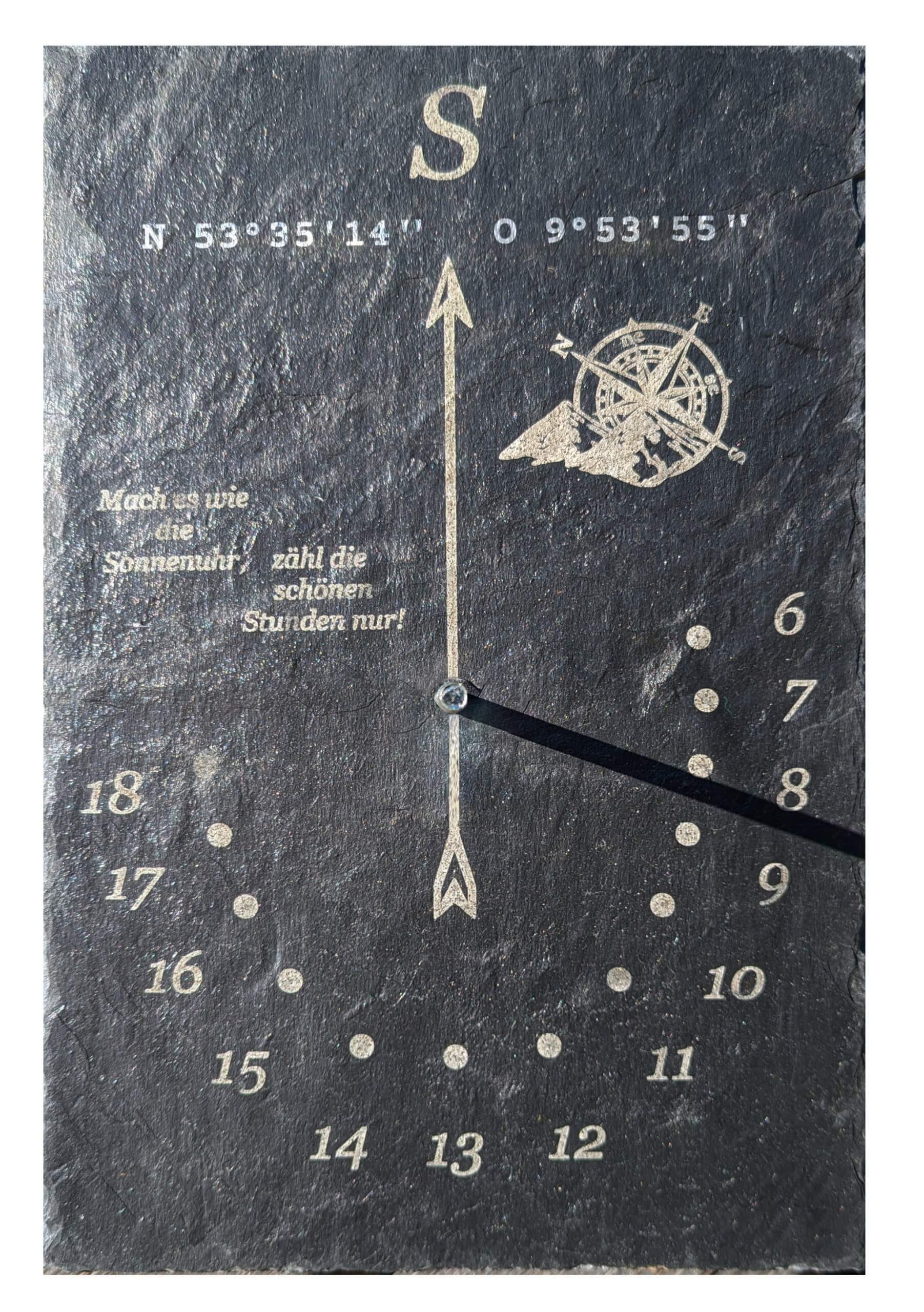 Sonnenuhr – Schieferplatte personalisiert mit „Texten, Motiv und Geodaten“. Grösse: 30cm x 20cm