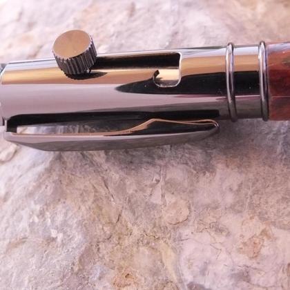 Dieser wunderschöne Klickkugelschreiber ist gänzlich handgefertigt und weltweit ein Unikat. Um das Holz so richtig strahlen zu lassen, wurde es geölt und danach eine gesundheits- und umweltunbedenkliche aber feuchtigkeits-, speichel- und schweißresistente Versiegelung aufgetragen und diese anschließend auf Hochglanz poliert. Somit ist der Stift hervorragend gegen Abgriff und Flecken geschützt. Auf Wunsch kann die Schreibfarbe in blau und schwarz ausgeliefert werden. Alle Schreibminen können ganz einfach bei mir nachbestellt werden, sind aber ebenso in Schreibwarengeschäften erhältlich. Geliefert wird der Stift in einer eleganten und stabilen Schachtel. Verwendet wurde gestocktes Zwetschkenholz (Prunus domestica)