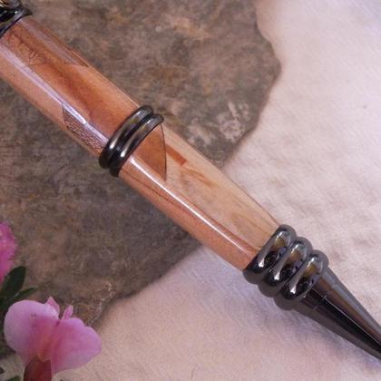 Dieser wunderschöne Drehkugelschreiber ist aus vielen kleinen Holzsttücken zusammengesetzt, gänzlich handgefertigt und weltweit ein Unikat. Um das Holz so richtig strahlen zu lassen, wurde es geölt und danach eine gesundheits- und umweltunbedenkliche aber feuchtigkeits-, speichel- und schweißresistente Versiegelung aufgetragen und diese anschließend auf Hochglanz poliert. Somit ist der Stift hervorragend gegen Abgriff und Flecken geschützt. Auf Wunsch kann die Schreibfarbe in blau und schwarz ausgeliefert werden. Alle Schreibminen können ganz einfach bei mir nachbestellt werden, sind aber ebenso in Schreibwarengeschäften erhältlich. Geliefert wird der Stift in einer eleganten und stabilen Schachtel. Verwendet wurden viele Holzarten.