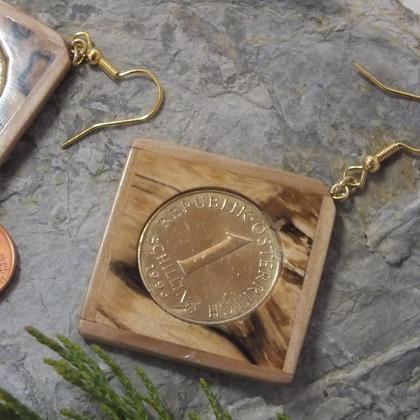Vor einiger Zeit habe ich alte Schillingmünzen gefunden und daraus Ohrringe gemacht. Diese wunderschönen und zugleich einzigartigen Ohrringe sind weltweit ein Unikat und gänzlich handgefertigt. Damit sie angenehm und federleicht zu tragen sind, wurden sie sehr dünn gefertigt. Um das Holz so richtig strahlen zu lassen, wurde es geölt und danach eine gesundheits- und umweltunbedenkliche aber feuchtigkeits-, speichel- und schweißresistente Versiegelung aufgetragen und diese anschließend auf Hochglanz poliert. Verwendet wurde Birke (Betula pendula) gestockt und Magnolie (Magnolia soulangeana).
