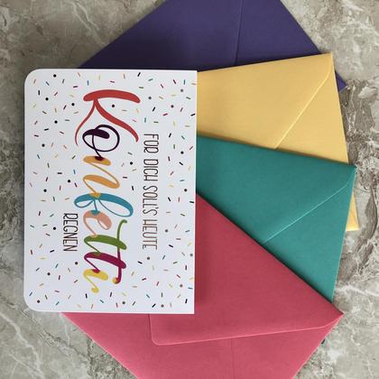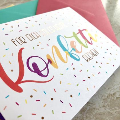 --Klappkarte mit Heißprägefolie in Roségold inkl. farbigem Kuvert und Konfetti.-- --Format:-- A6 (148 x 105 mm) mit abgerundeten Ecken. „Für dich soll’s heute Konfetti regnen“ – ein Spruch der sowohl für Geburtstage, bestandene Prüfungen und auch einfach so passt! Der Schriftzug wurde liebevoll von Hand geschrieben und digitalisiert. Das hochwertige 340g Papier wurde zusätzlich mit Heißprägefolie in Roségold veredelt. Um dem Spruch mehr Ausdruck zu verleihen darf eines natürlich nicht fehlen: KONFETTI! Das gibt’s mit dazu. Das farbige Kuvert (Wunschfarbe frei wählbar) ist selbstverständlich auch dabei.