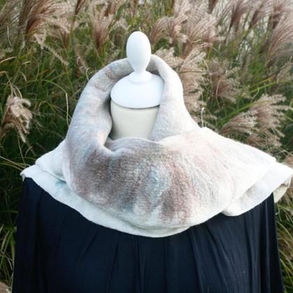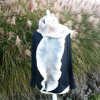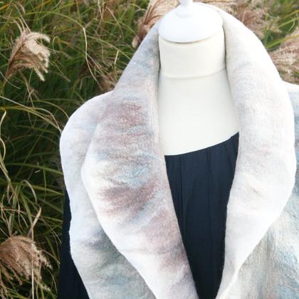 Eindeutig nicht von der Stange ist dieser Schalkragen, den ich in einer speziellen Technik handgefilzt habe. Die sehr kuschelig weiche Merinoschafwolle habe ich per Hand gefärbt und ist deswegen auch farblich ein Unikat. Hauchzart legt sich dieser Kragen schmeichend um Ihren Hals. Größe: ca. 145 cm x 25 cm Material: 95% Merinoschafwolle 16 mic (mulesingfrei) 5% Seide