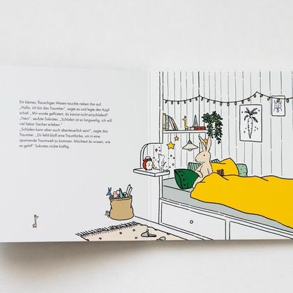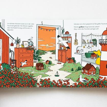 Eine Gutenachtgeschichte. Als Sokrates nicht einschlafen kann, zeigt ihm das Traumtier bunte, spannende Traumwelten. Auf detailreichen Bildern gibt es einfache Suchaufgaben zum Farben Lernen. Pappbilderbuch für 3-6 Jahre | Vicky Bo Verlag Illustration & Text von Lisa Scherzer in Deutschland gedruckt ISBN 978-3-944956-92-3 17 x 17 cm Papp-Karton (400g) 11 Doppelseiten (22 Seiten)
