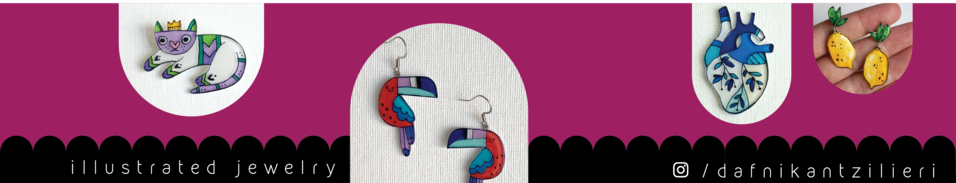 Acrylic jewelry are illustrated and painted by hand, with bold colors and funny designs.