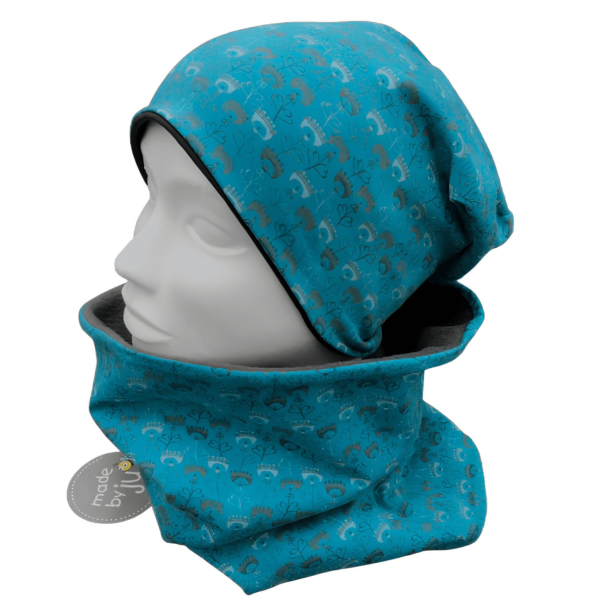 DAMEN- SET (WENDEHAUBE+XXL-LOOPSCHAL)- dezente gezeichnete Blumen türkis