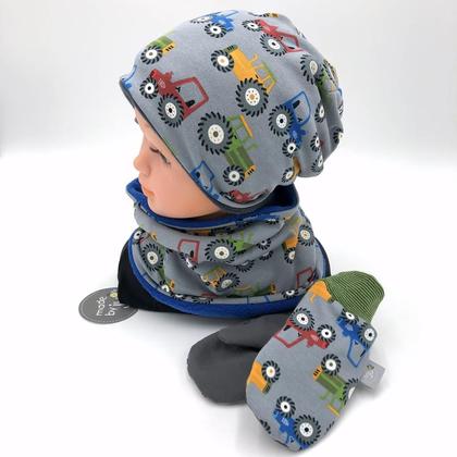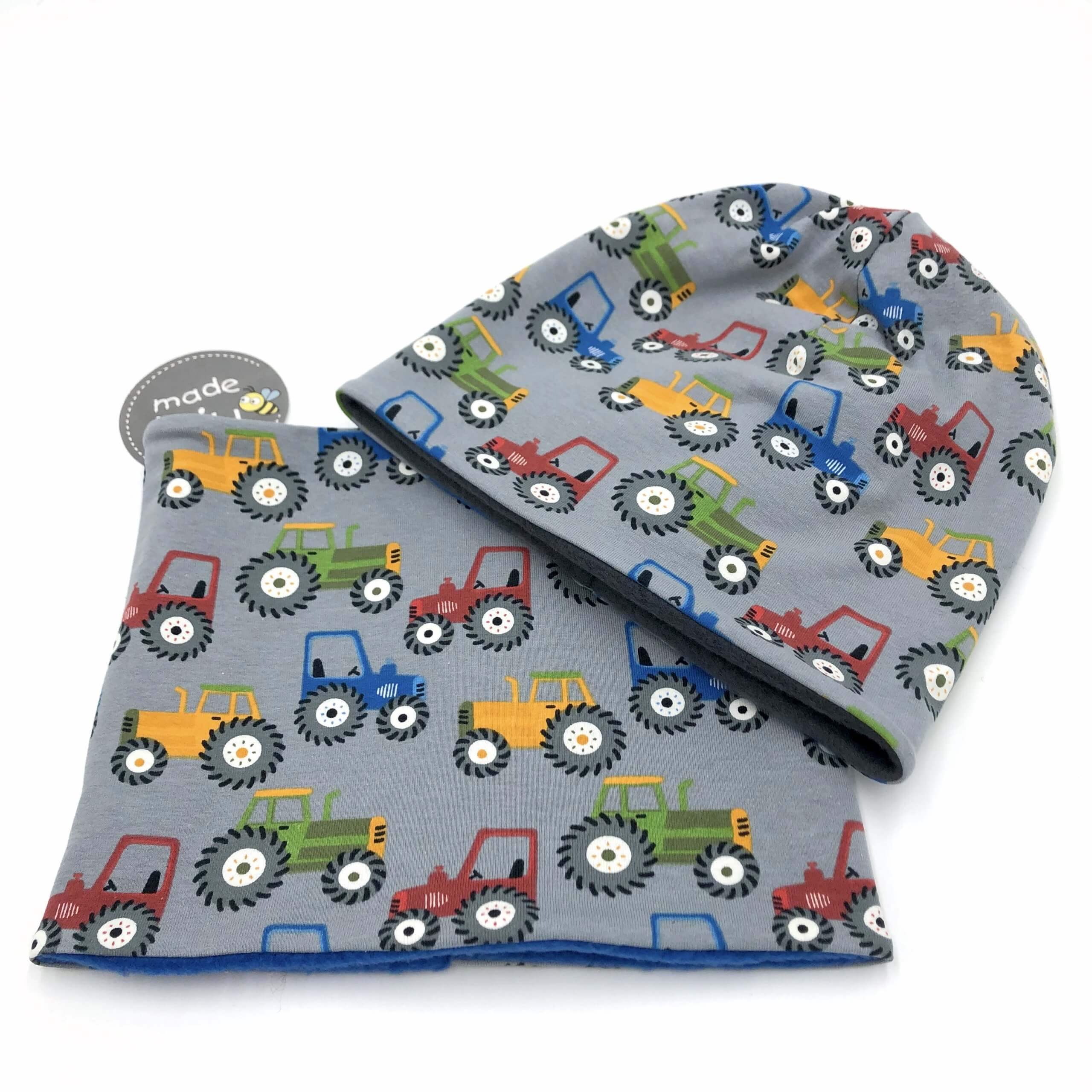 SET HAUBE+LOOPSCHAL TRAKTOR bunt grau (Ausführung und Größe wählbar)