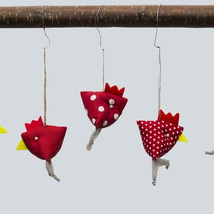 4 Stk. Hühnchen aus Baumwollstoff, gefüllt mit Schafwollbällchen, der Kamm und der Schnabel sind aus Filz, die Augen aus Wachsperlen. Grösse: 6cm Gewicht: 4 Gramm